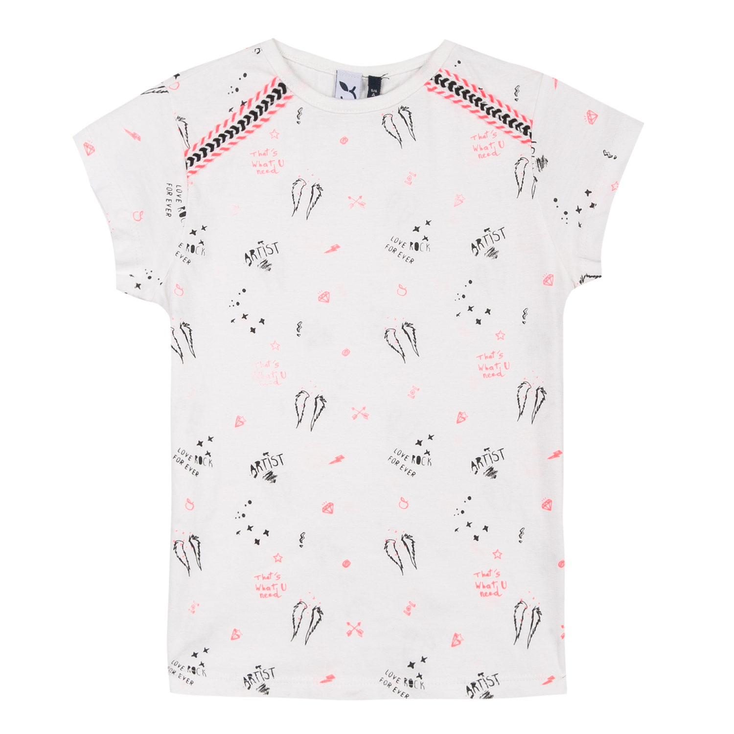 T-shirt branca com estampado preto e rosa com desenhos variados e texto ARTIST