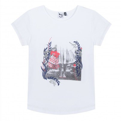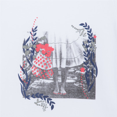 • Detalhes: Foto de uma menina de vestido claro e descalça está impressa no peito. A impressão é aprimorada com desenhos de algas coloridos e com lantejoulas. Bordas das mangas e a parte inferior da t-shirt são sublinhadas com costuras de lurex prata.