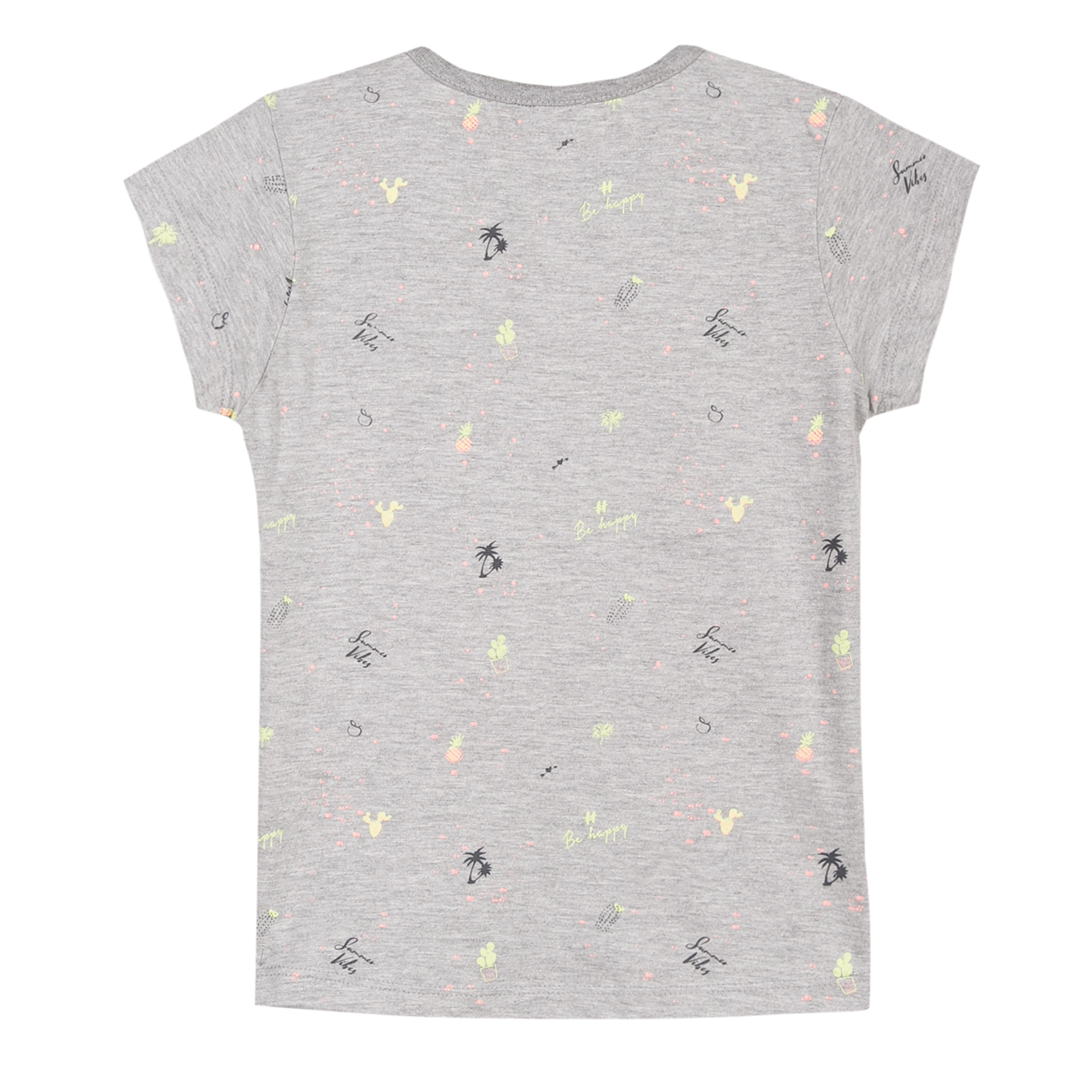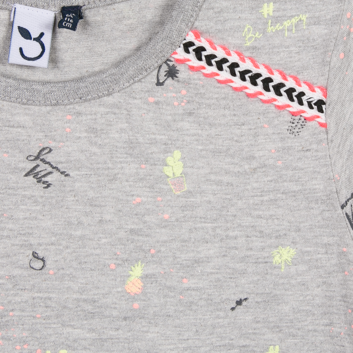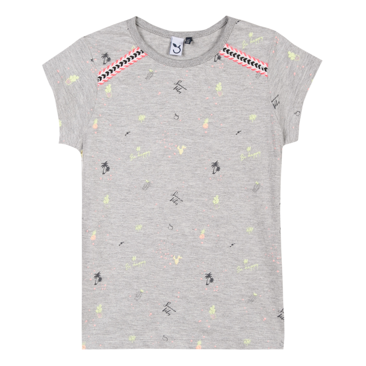 T-shirt cinzenta para criança com estampas multicoloridas e detalhe chevron nos ombros