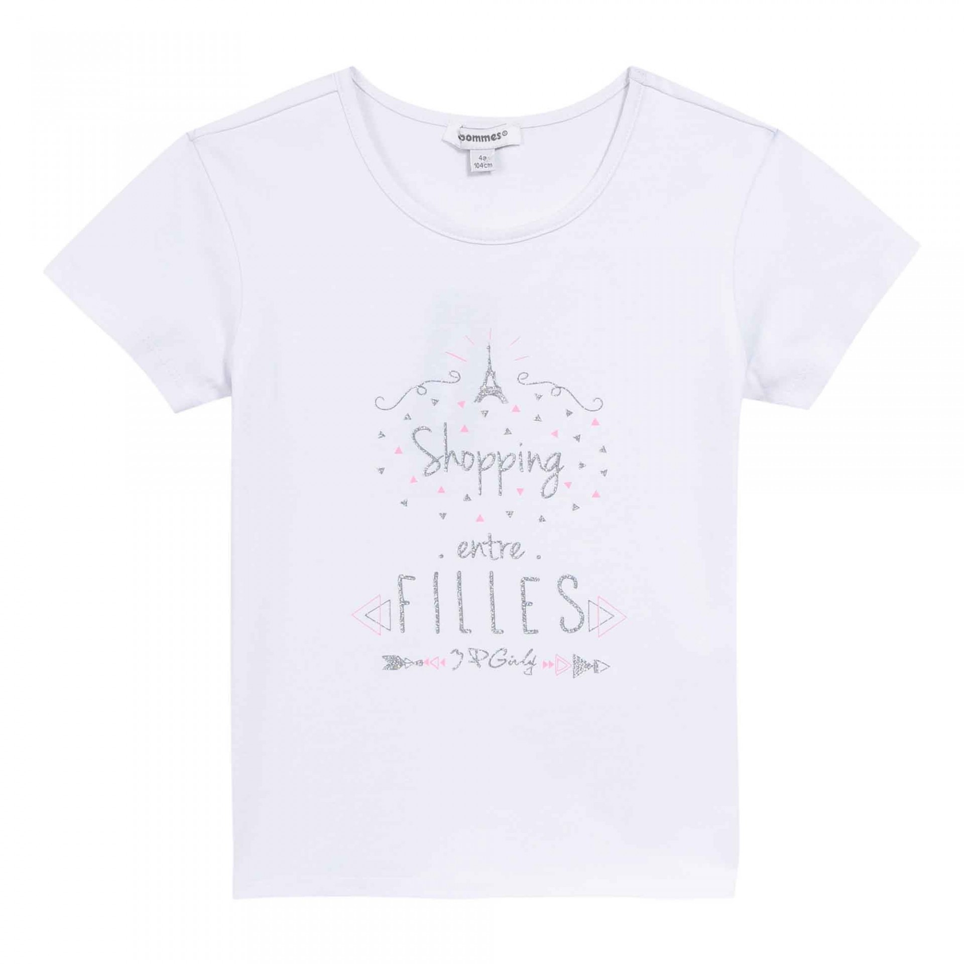 T-shirt branca de manga curta com estampado e texto em tons pastel e cinza