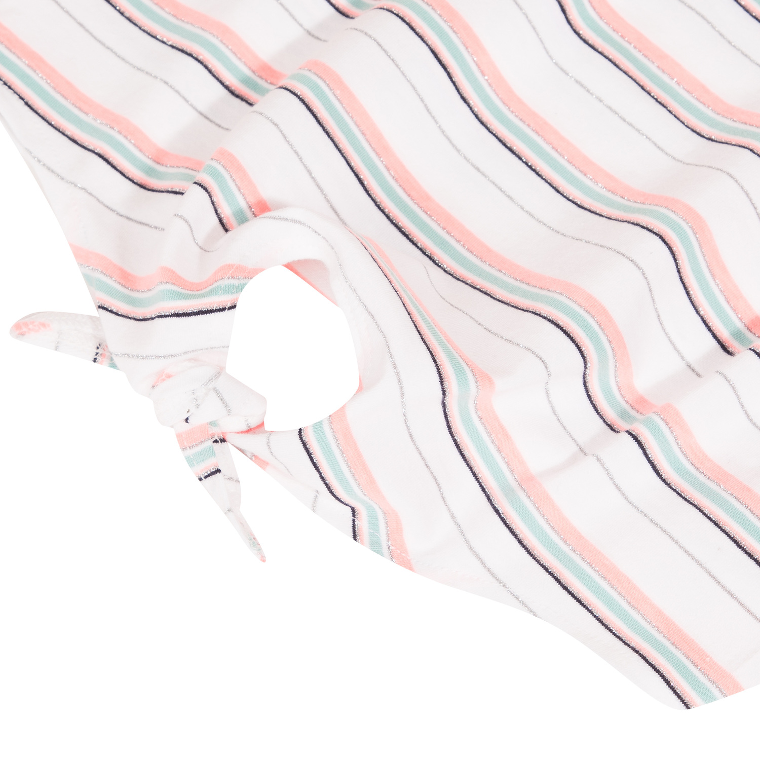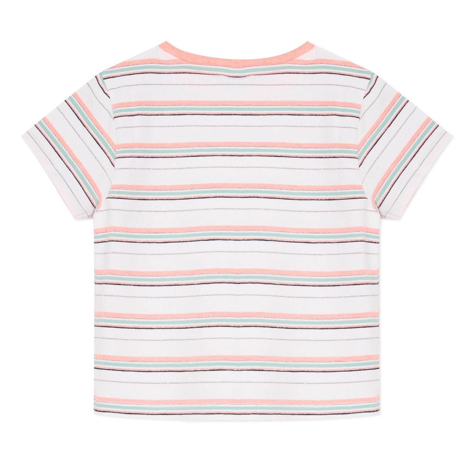 • Detalhes: T-shirt branca com listras laranja, azul e glitter. Detalhe de um laço na zona inferior.
