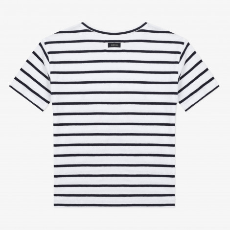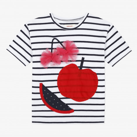 Detalhes: T-shirt branca com riscas azul marinho. Detalhes de frutas coloridas e borlas de malha, frontais. Lavar à máquina a 30 ° C. Assinatura Catimini.