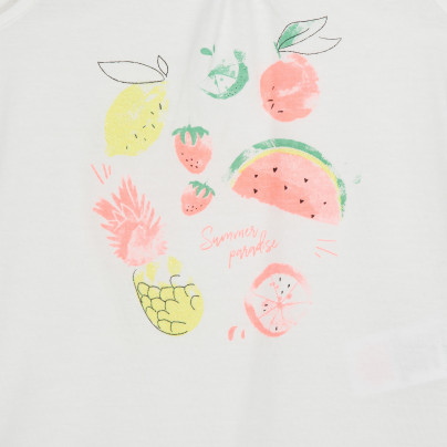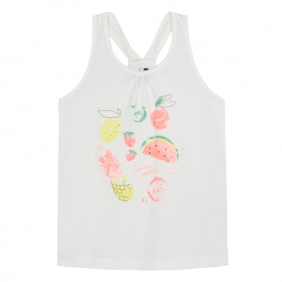 Camiseta branca de alças com estampado de frutas coloridas e texto