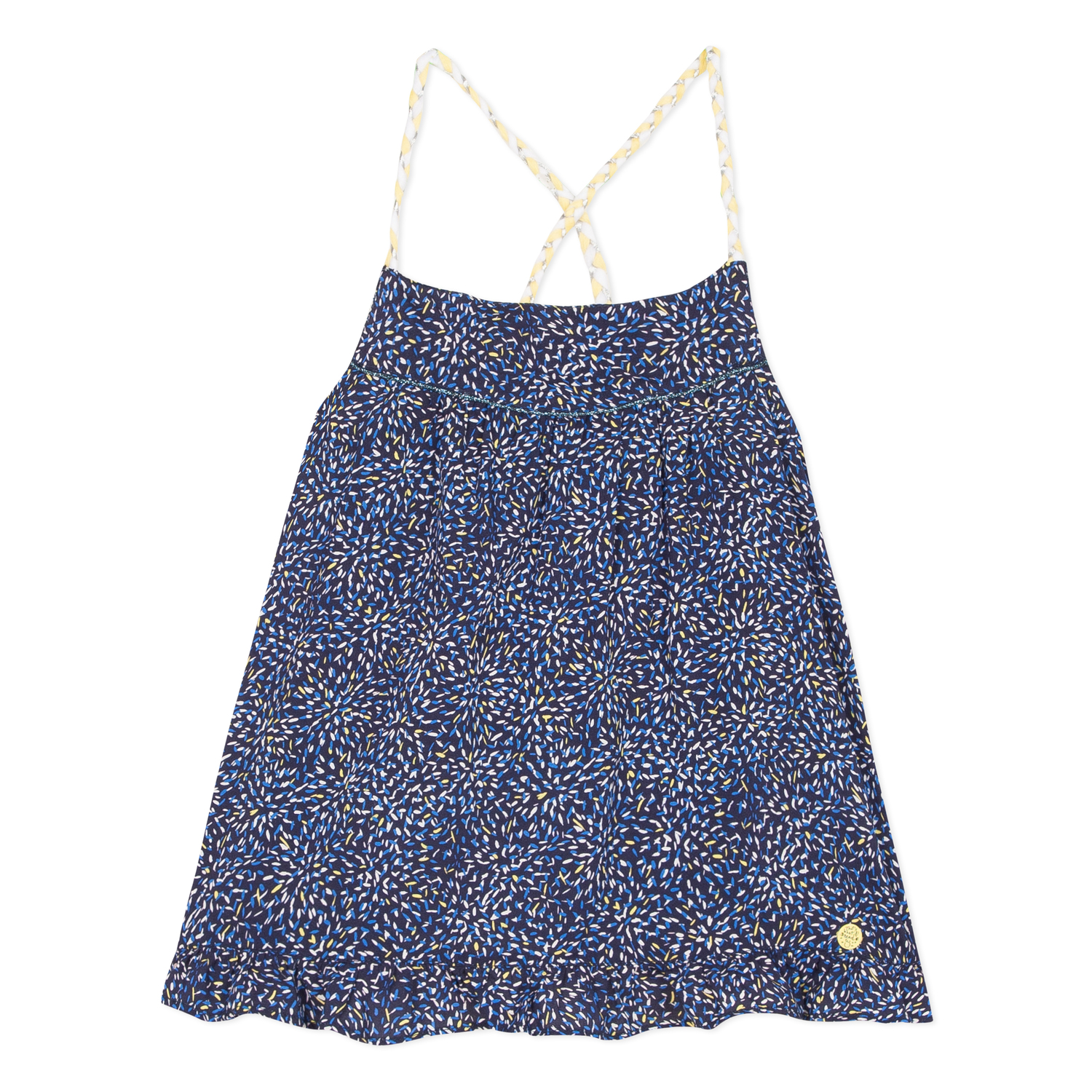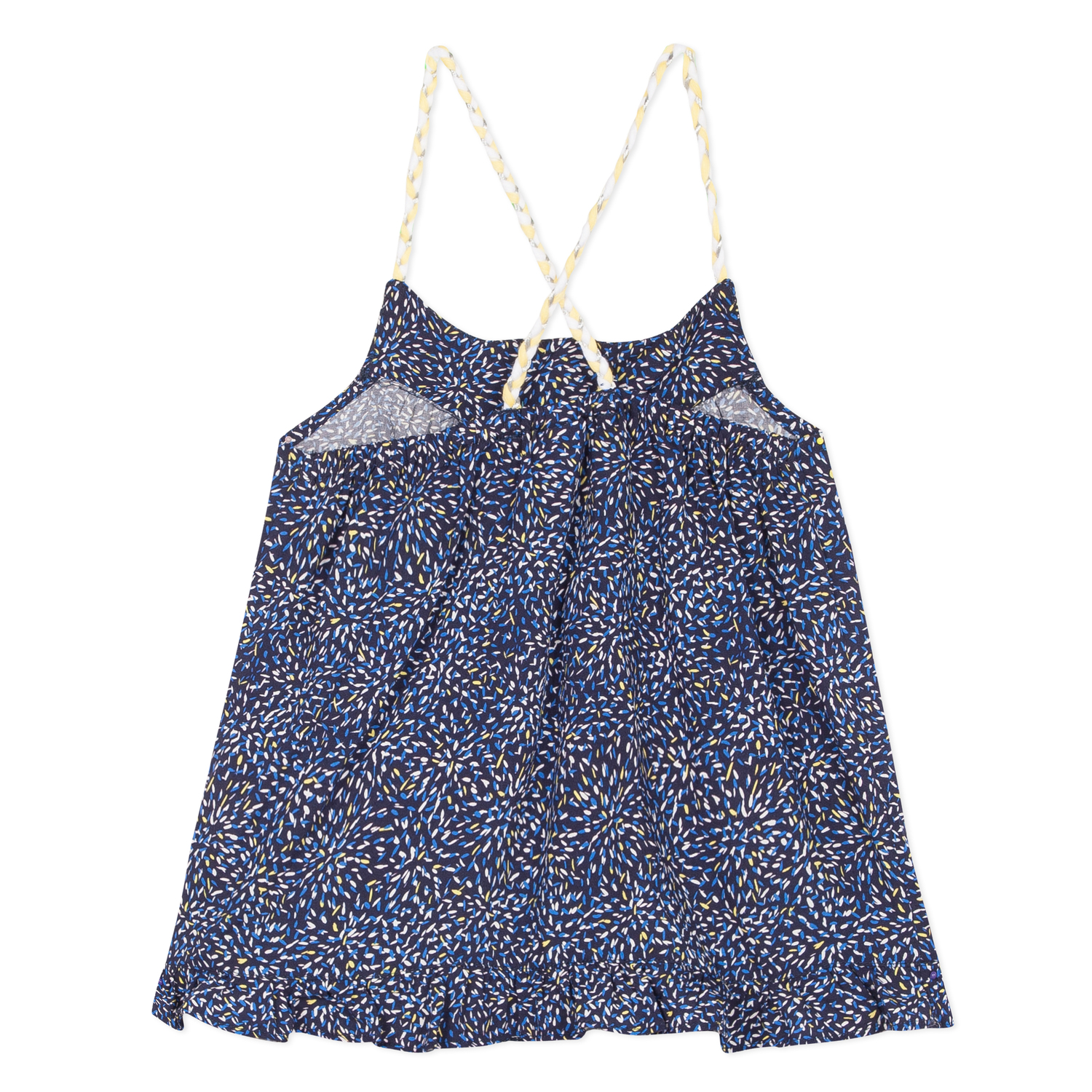 • Detalhes: Top com tiras finas em amarelo, nas costas. Azul com padrão em branco/amarelo.
