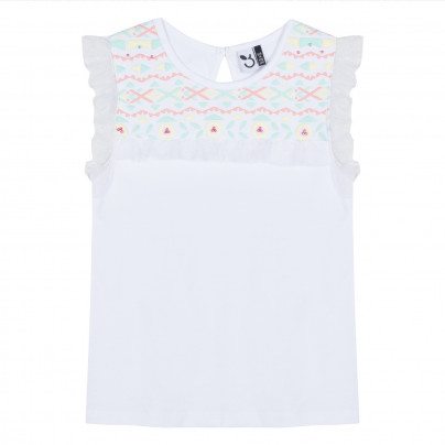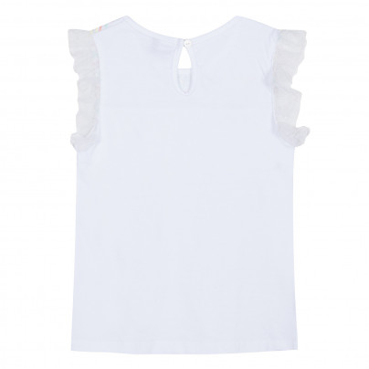 Camisola branca para criança com padrão colorido e babados nas mangas