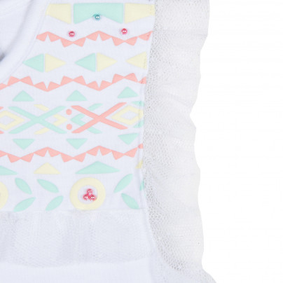 • Detalhes: Gola graficamente embelezada com motivos étnicos impressos em tons pastel. Os desenhos são emoldurados por tule com bolinhas. O padrão é realçado por pérolas rosa e azuis.