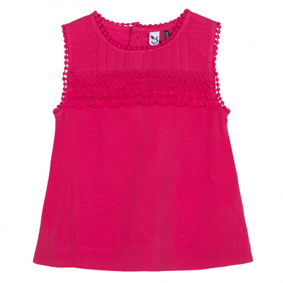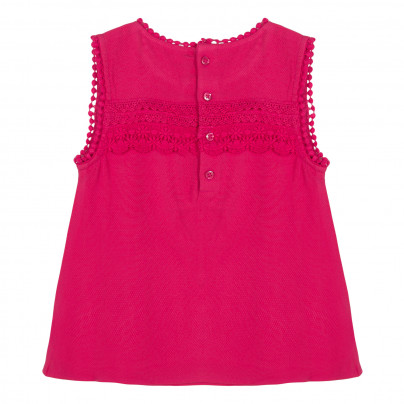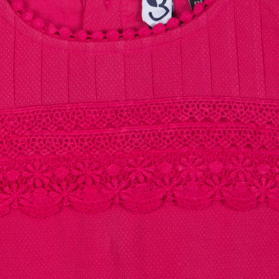 • Detalhes: Top rosa cereja. Peito e costas com dobras planas e guarnições em renda. É completado por bordas com espinhas no colarinho e ao redor dos braços.