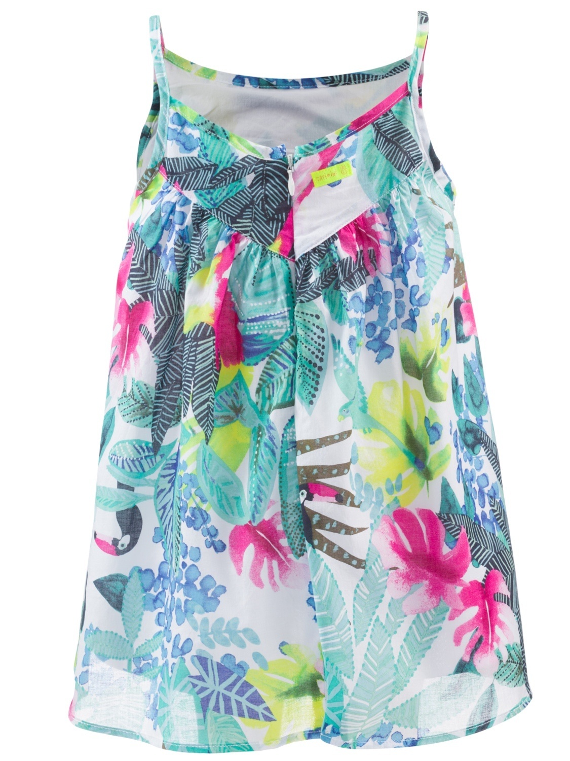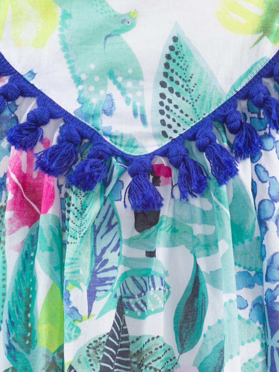 Vestido infantil floral colorido com franjas azuis e alças finas