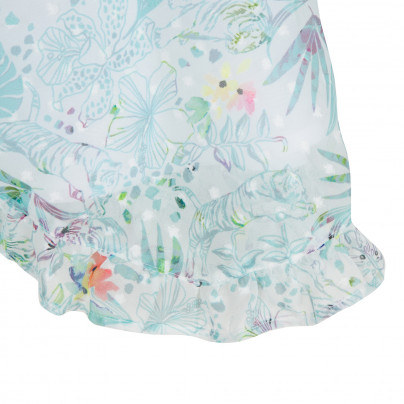 • Detalhes: Top colorido em tons pastel, com um padrão de tigre e selva tropical. A superfície é delicadamente pontuada com relevo. O tecido abre na frente e atrás, mas tem forro branco.