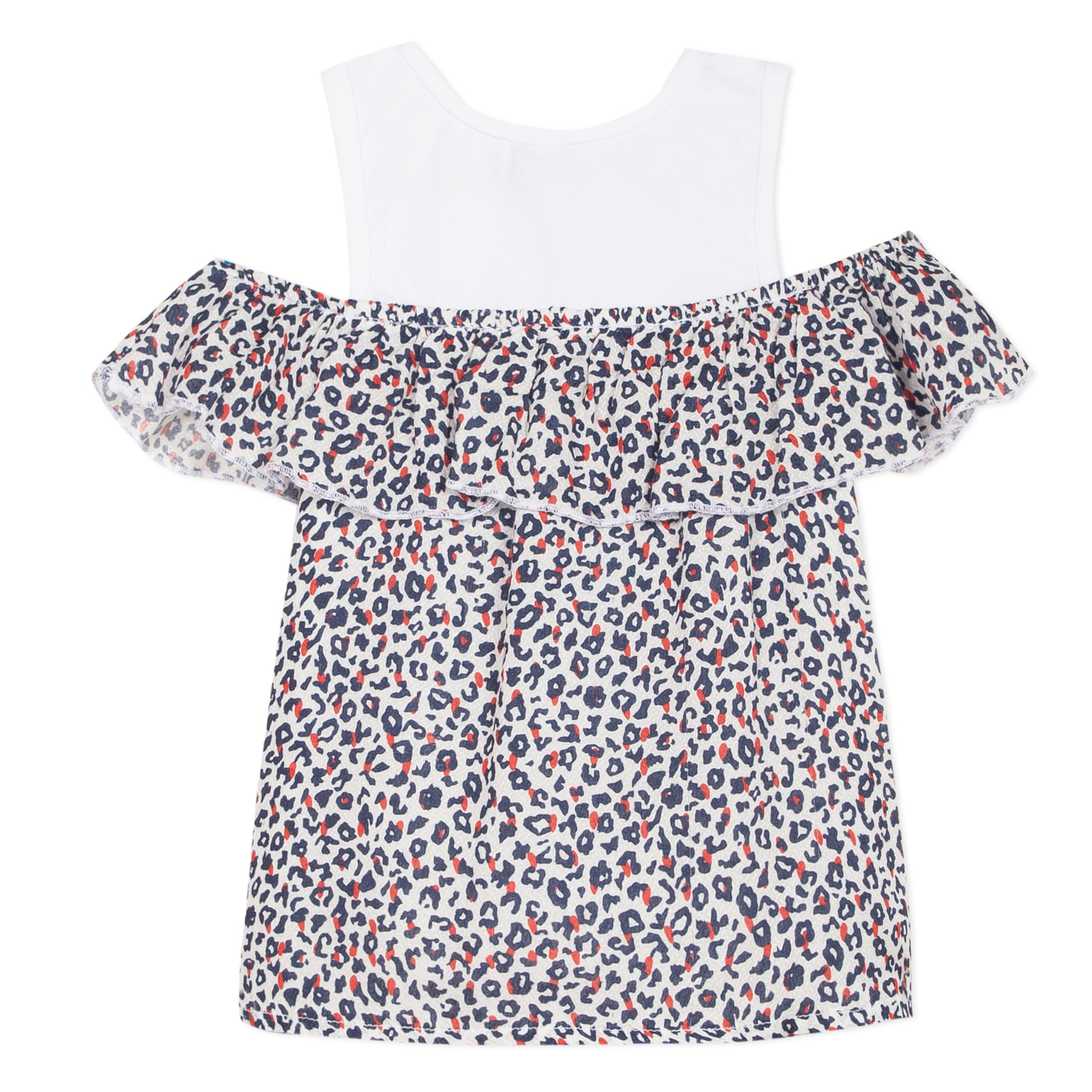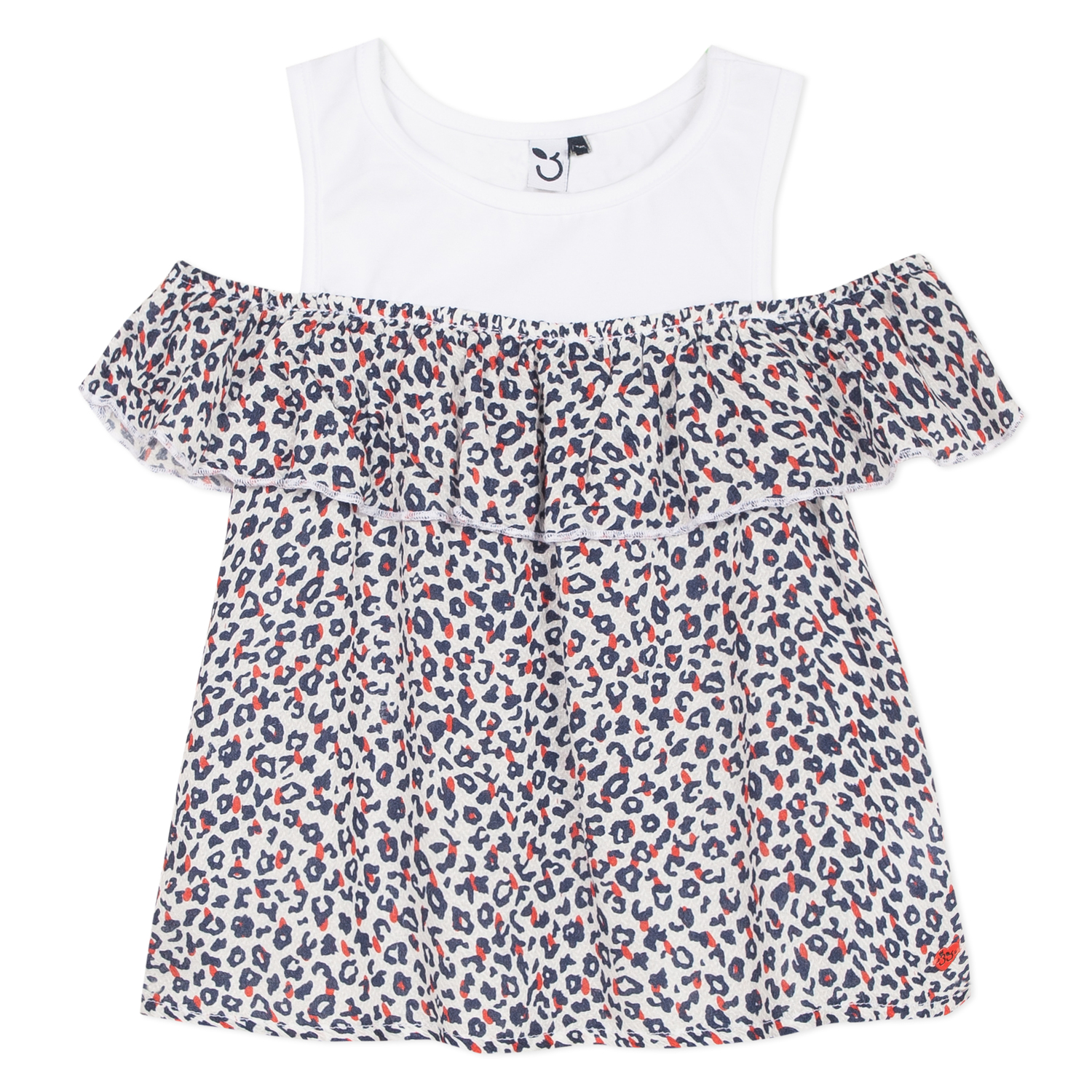 Camisola branca com padrão animal print nos folhos e na parte de baixo
