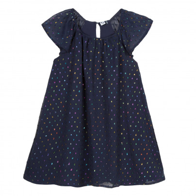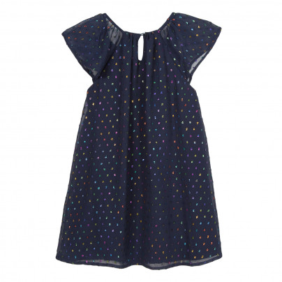 Vestido azul escuro com pontos coloridos e mangas curtas