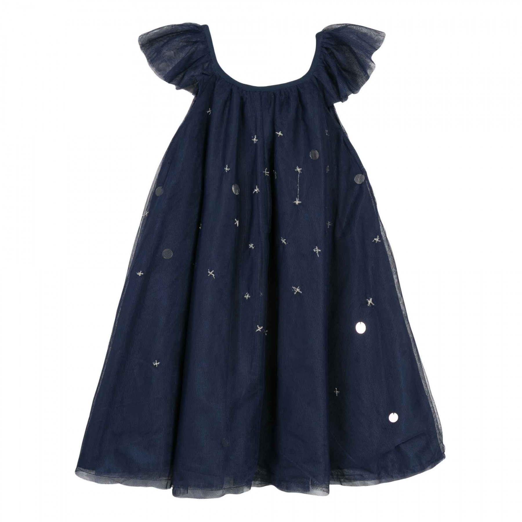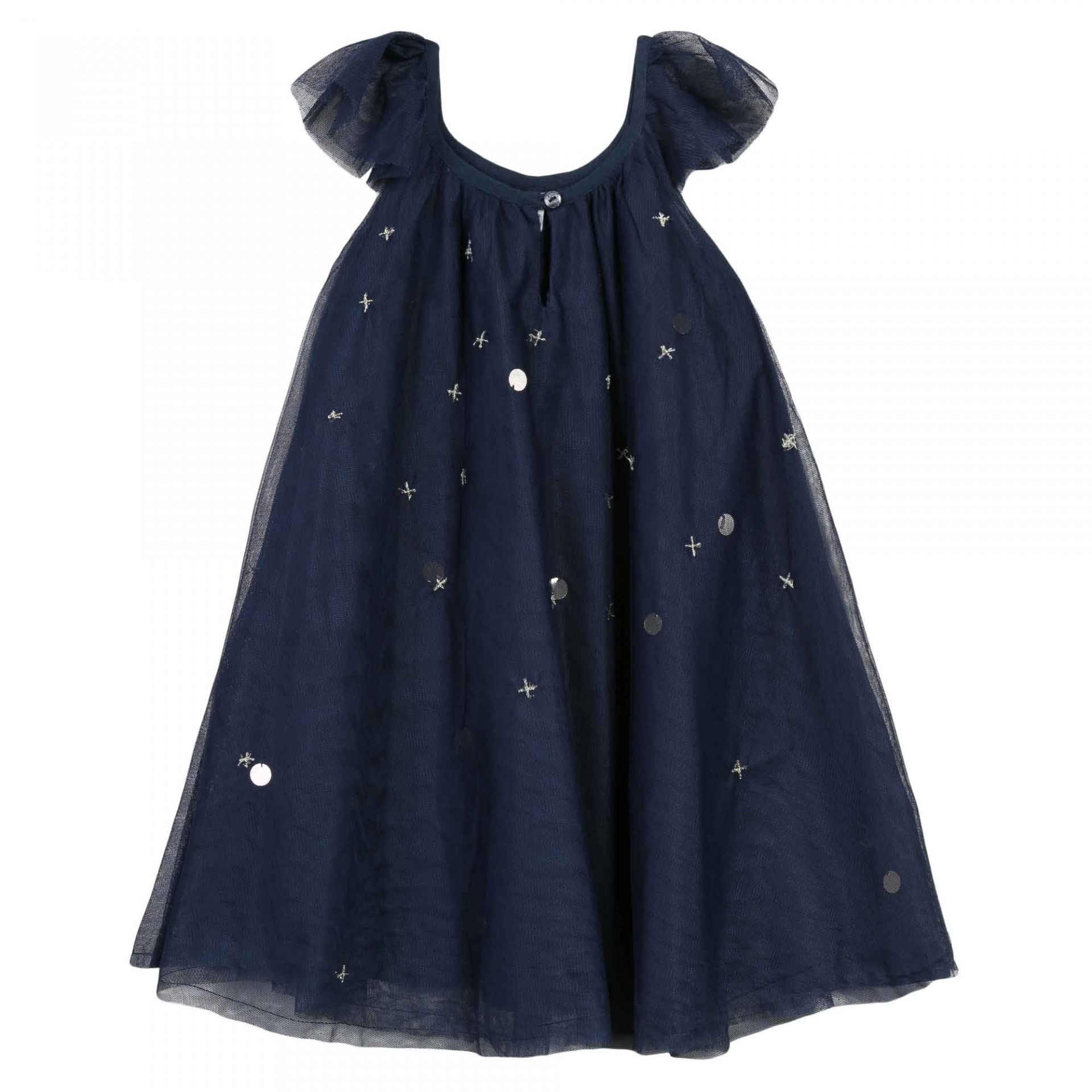 Vestido azul escuro com estrelas prateadas e mangas em tule para menina