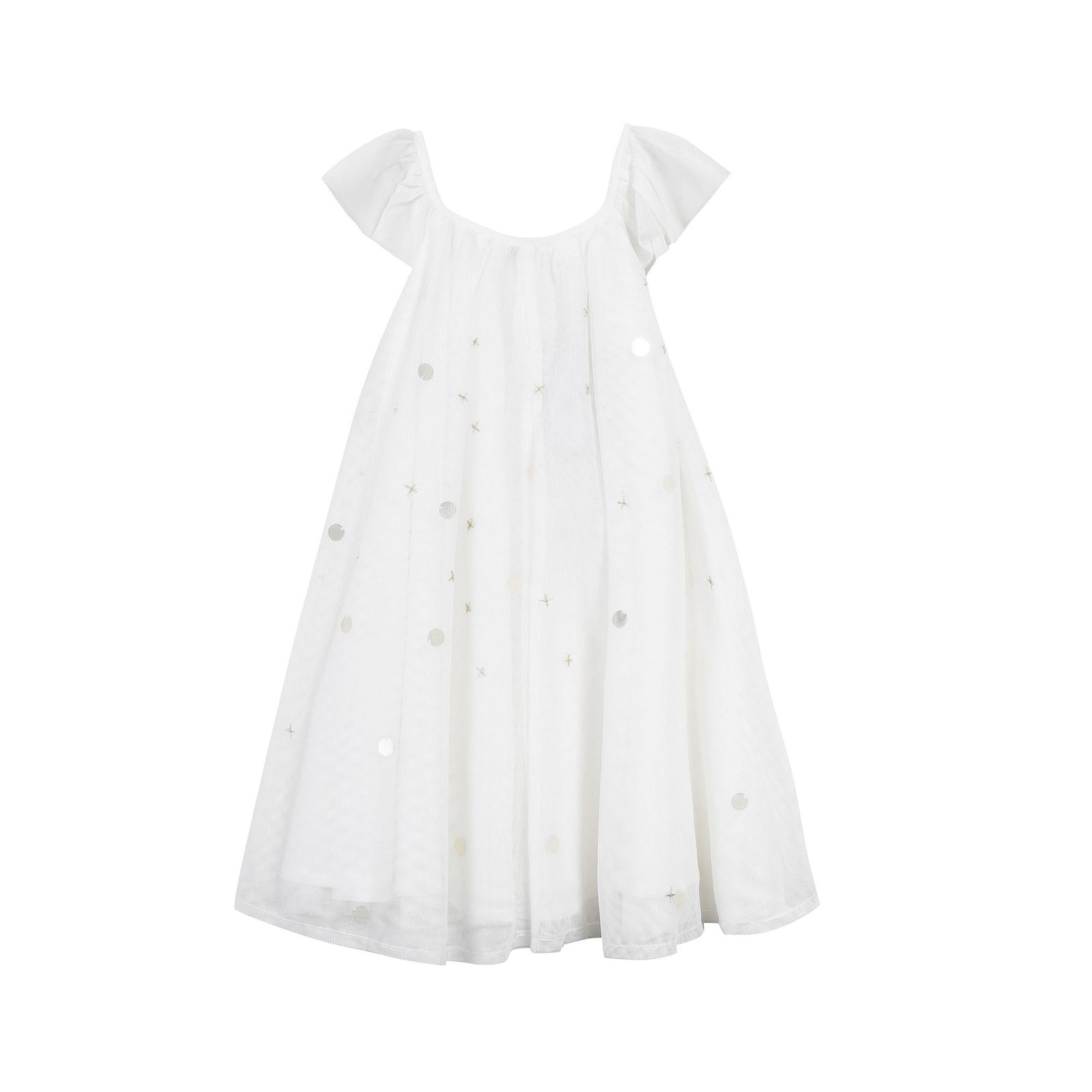Vestido branco infantil com pequenas lantejoulas prateadas