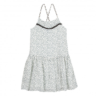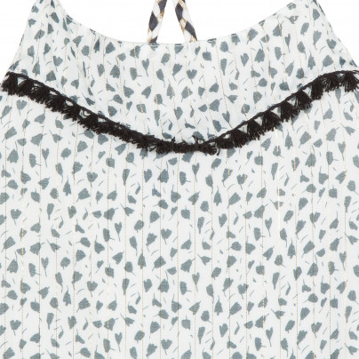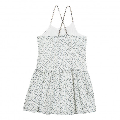 Vestido branco com padrão de folhas pretas e alças finas cruzadas