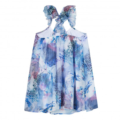 Vestido de criança padrão azul roxo rosa com alças trançadas