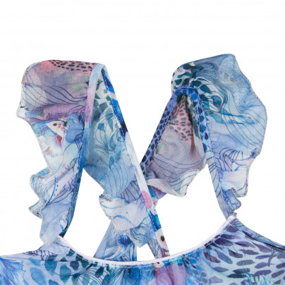 • Detalhes: Padrão gráfico inspirado no mundo mágico do oceano. Tons de malva, rosa e azul. Alças cruzadas nas costas.