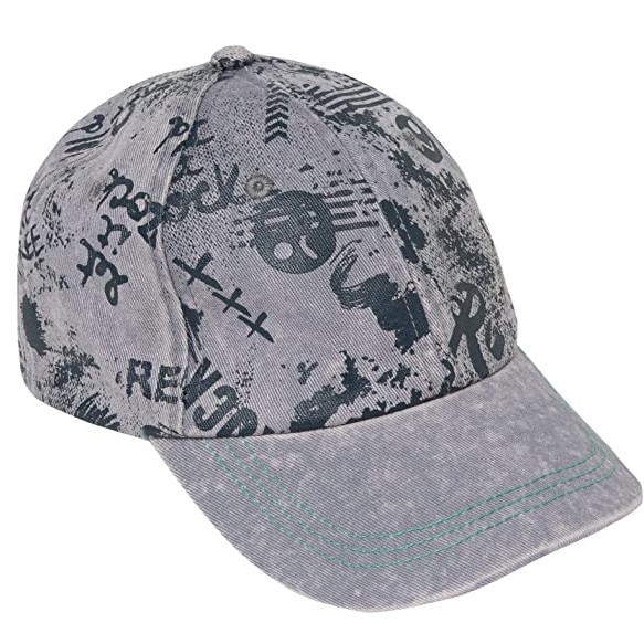 Boné cinza com padrões negros e pala com costura verde