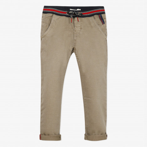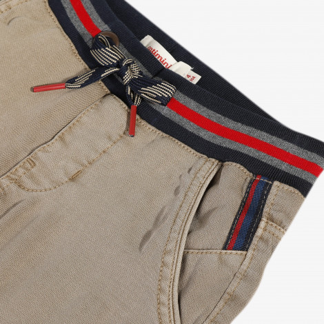 Calças infantis bege com cós elástico e cordão, bainha dobrada
