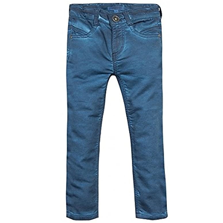 Calças compridas de criança azuis com bolsos frontais e botão
