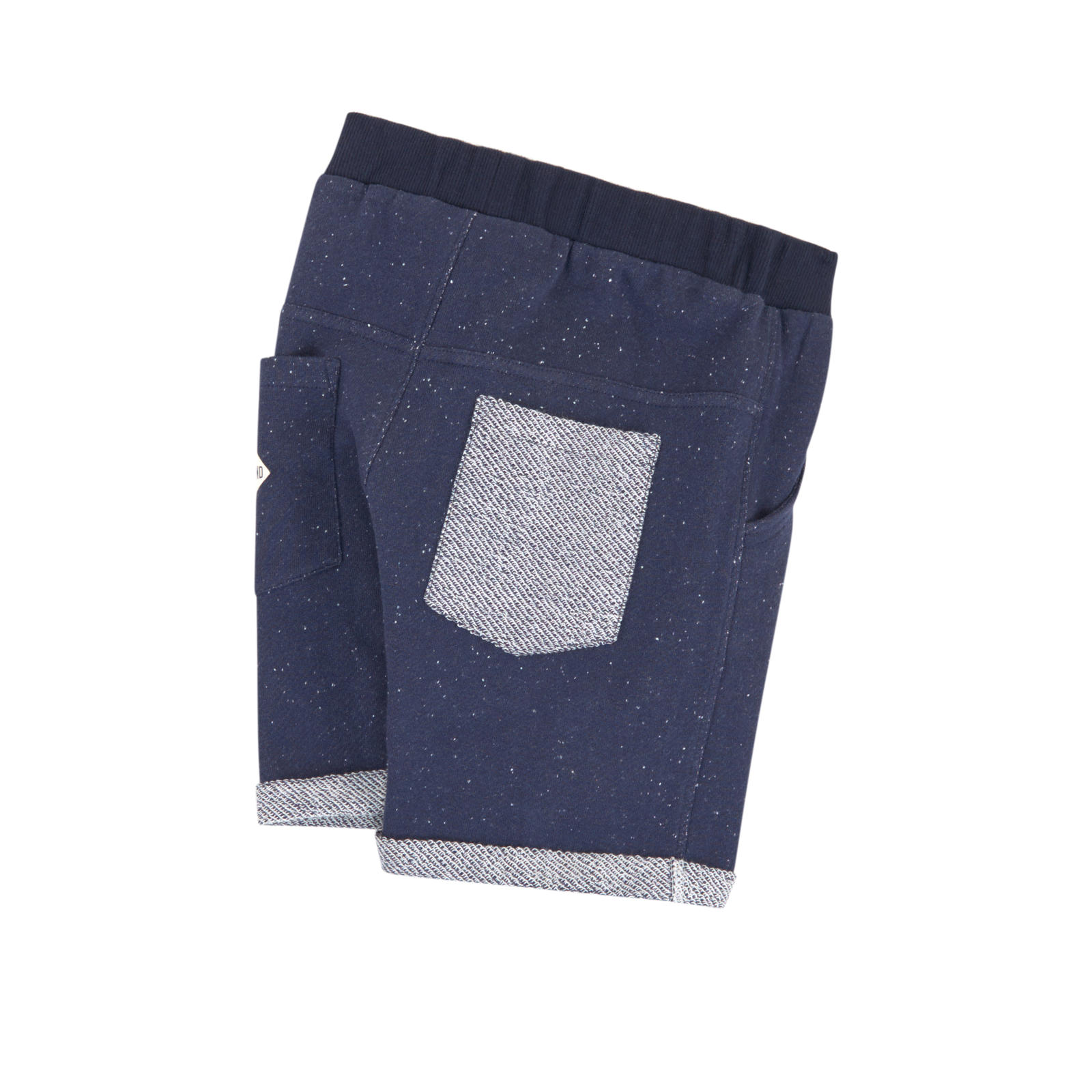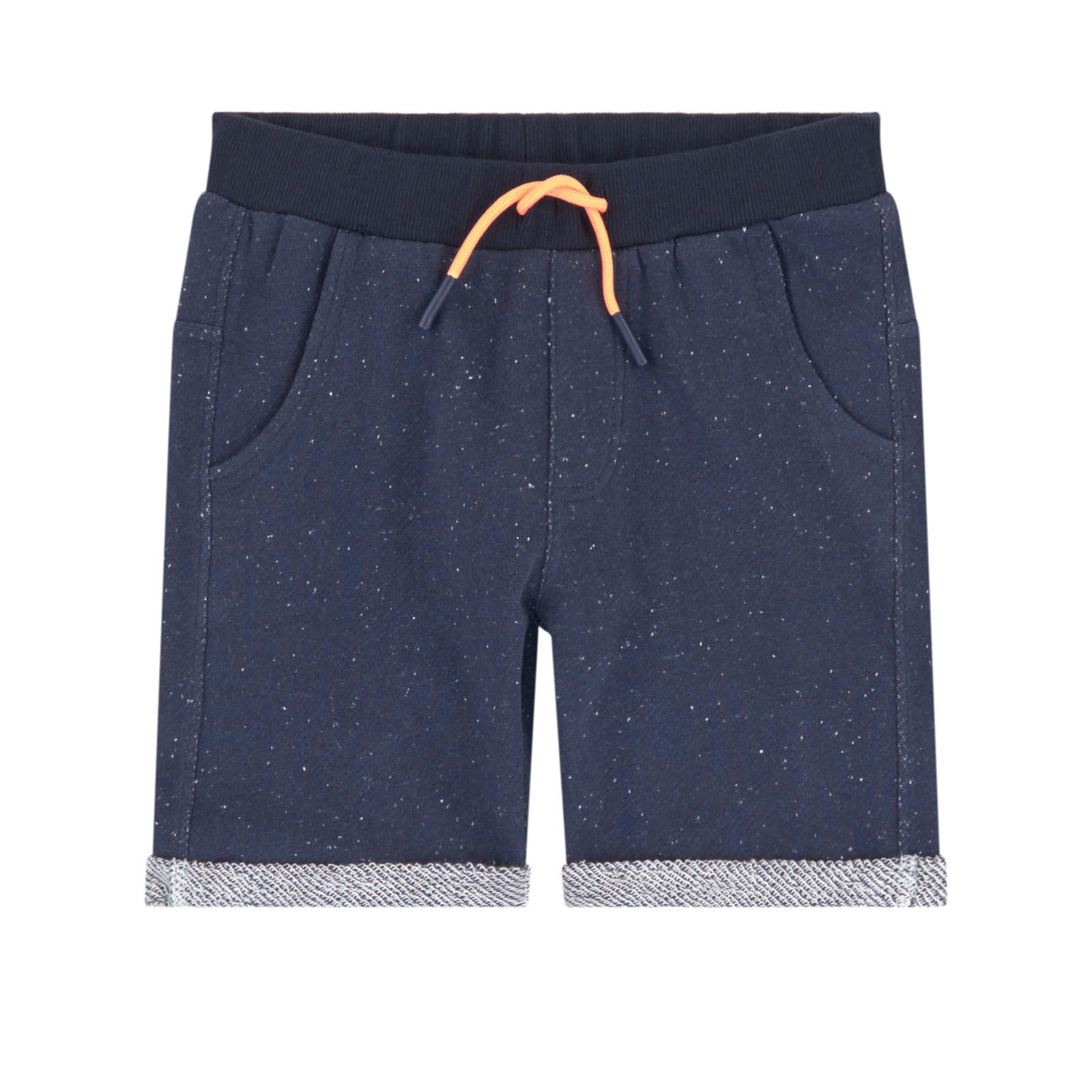 Calções infantis azuis escuros com cordão laranja e bainha riscada cinzenta