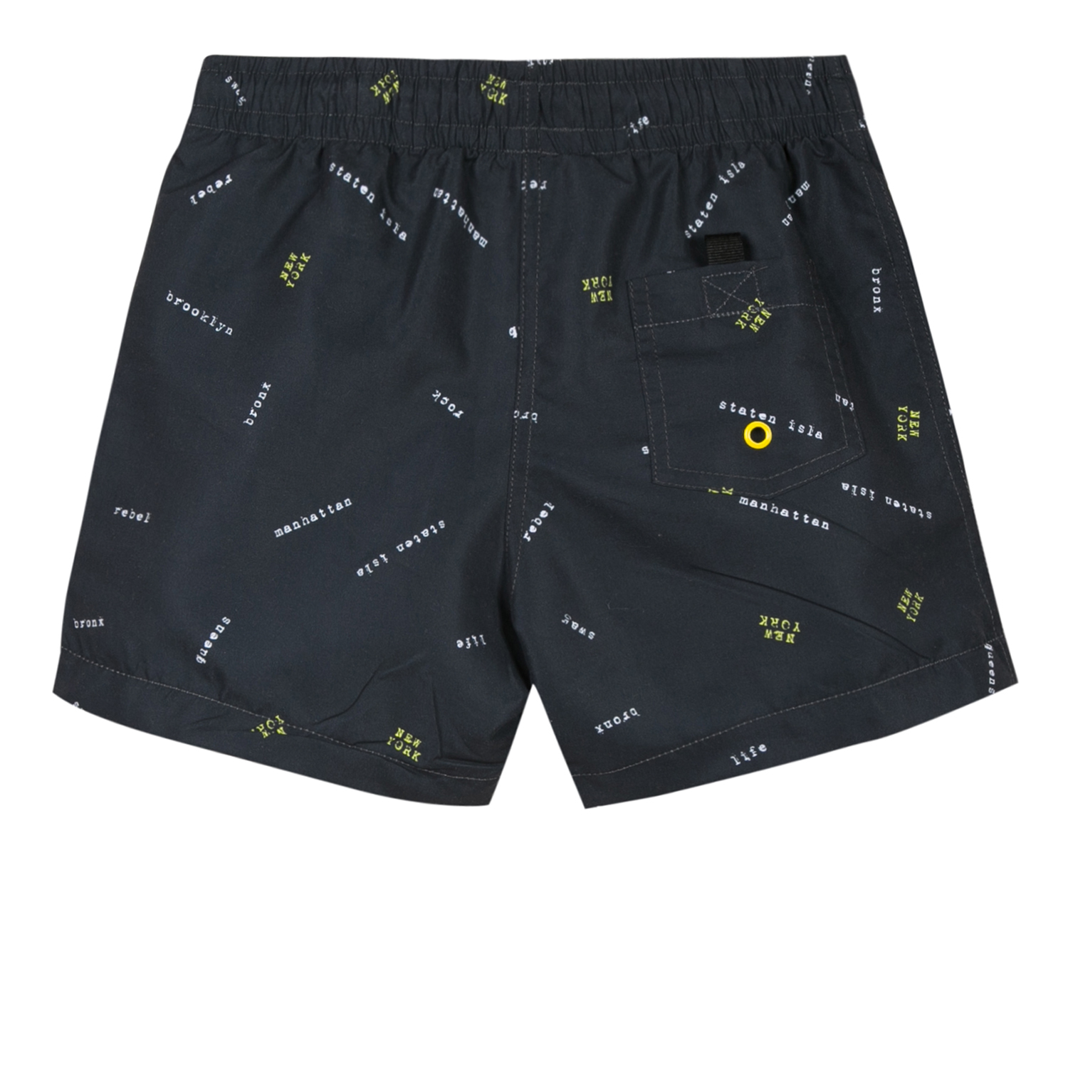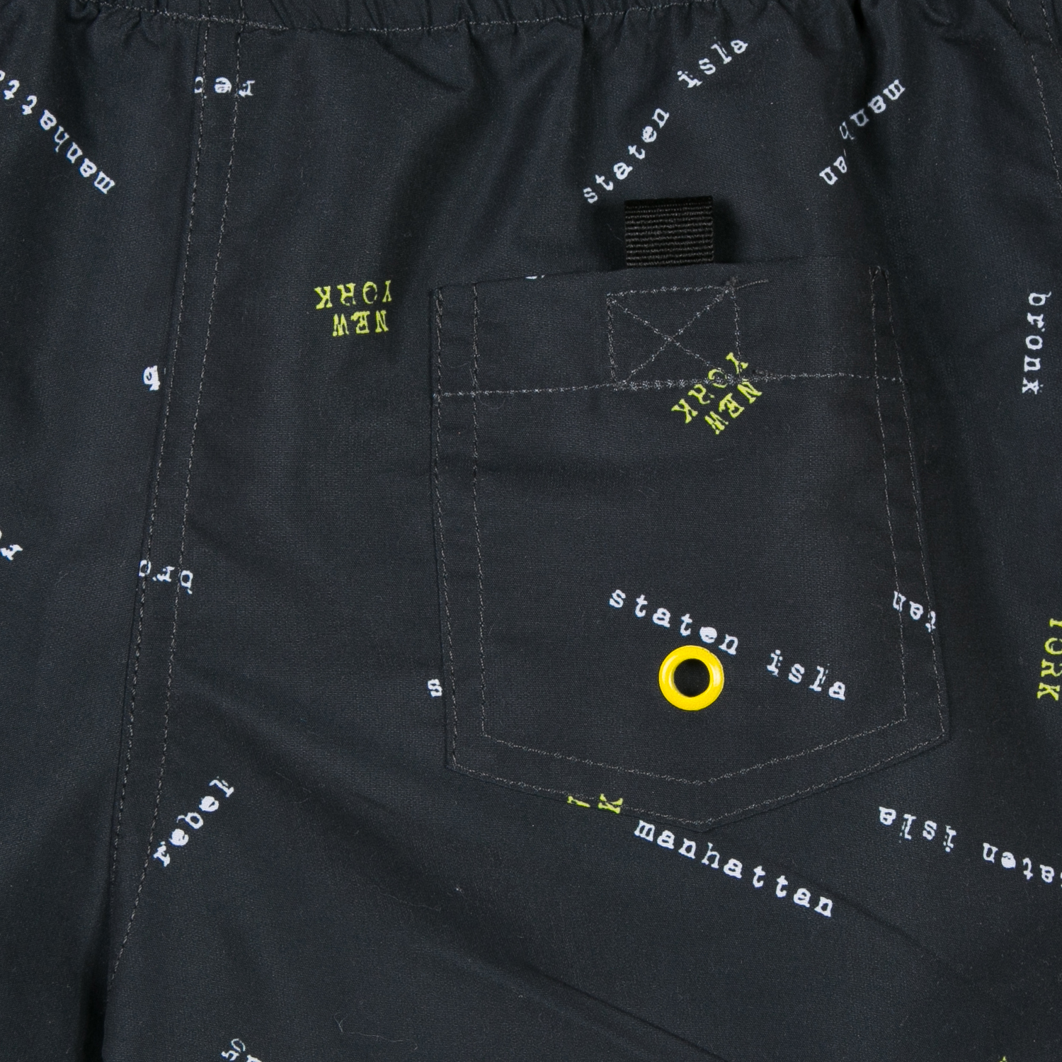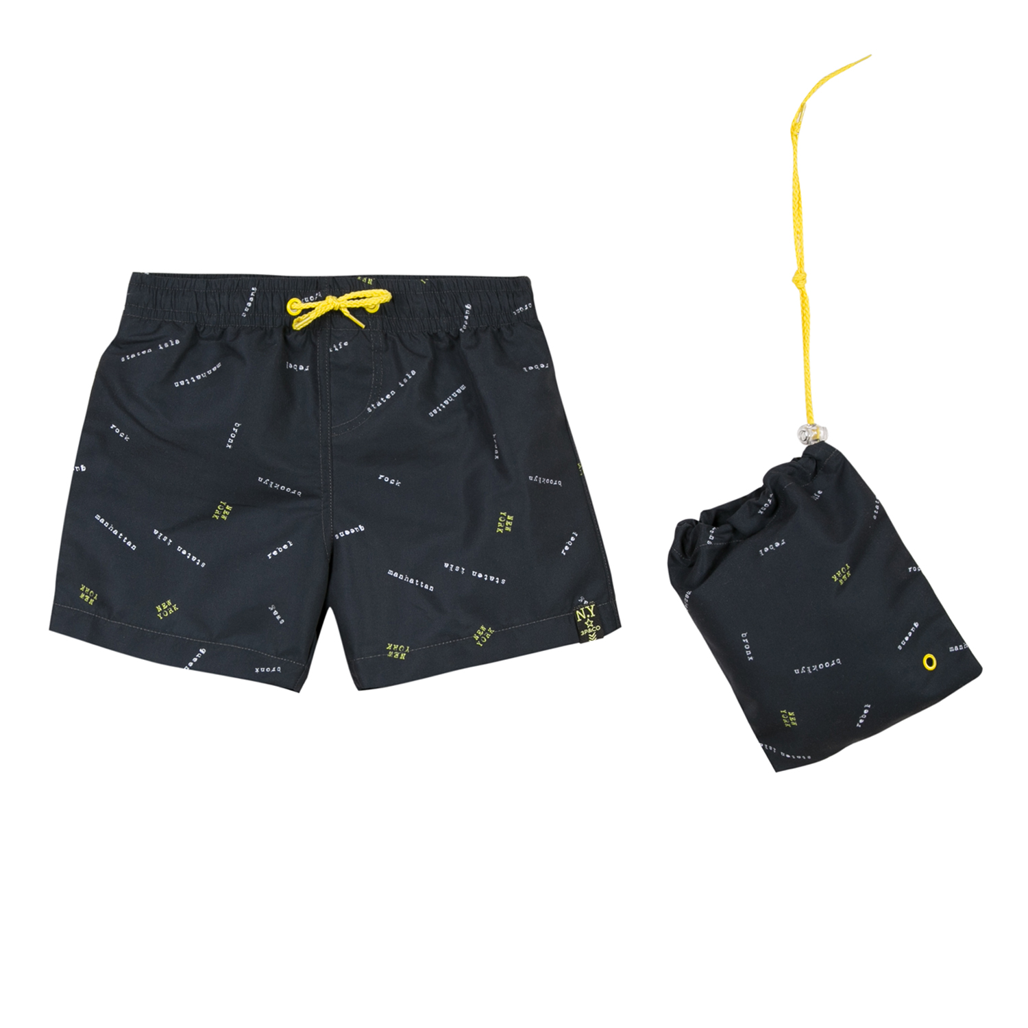 Calções de banho pretos com padrão de texto e saco a condizer com cordão amarelo