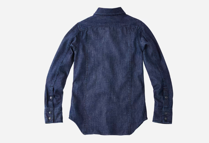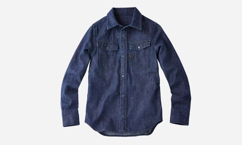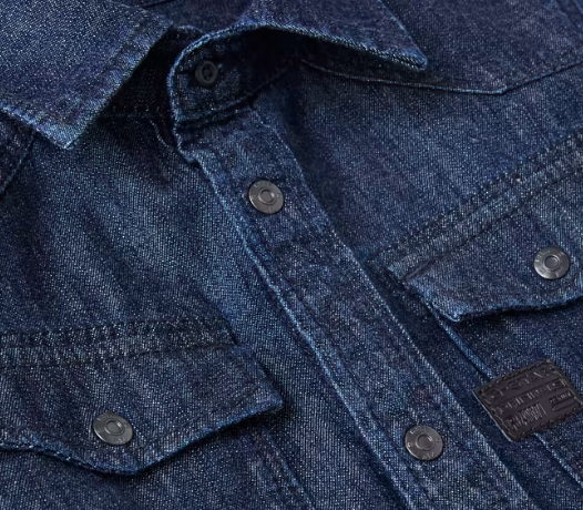 Camisa de ganga azul escuro com botões e bolsos no peito