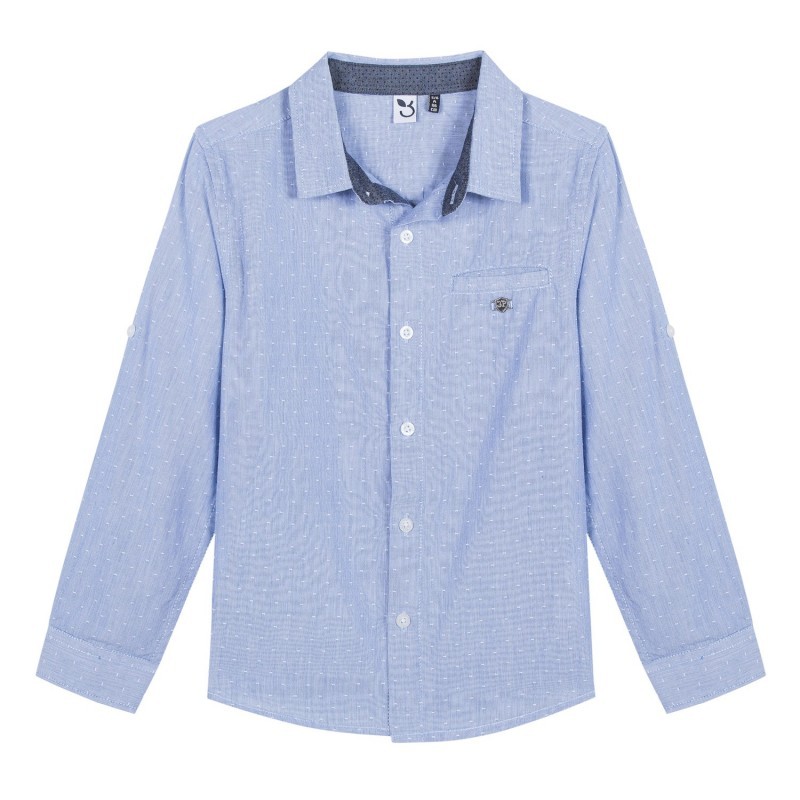 Camisa azul clara de menino com botões e bolso no peito