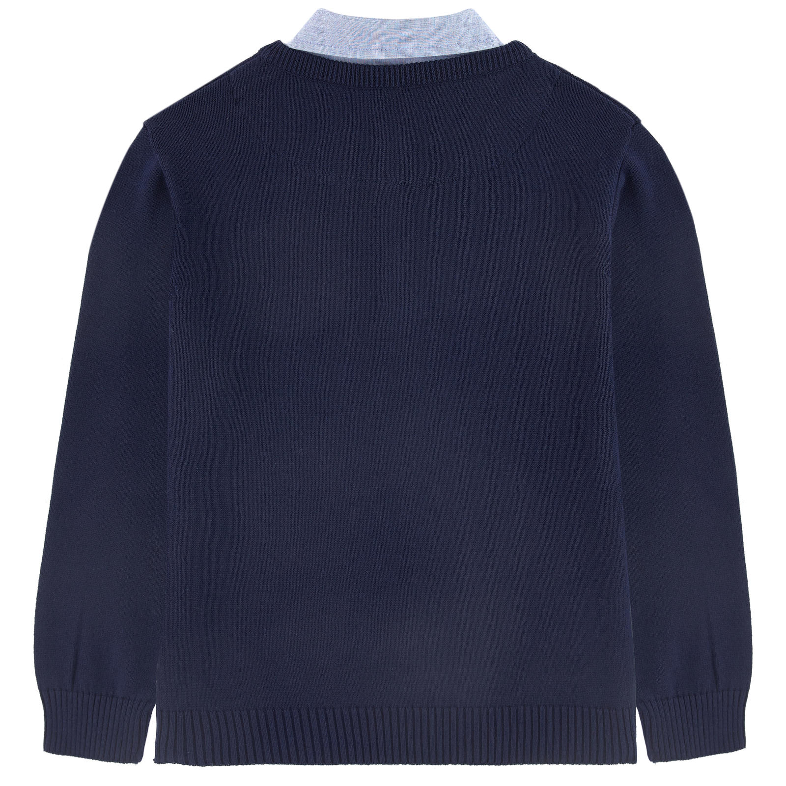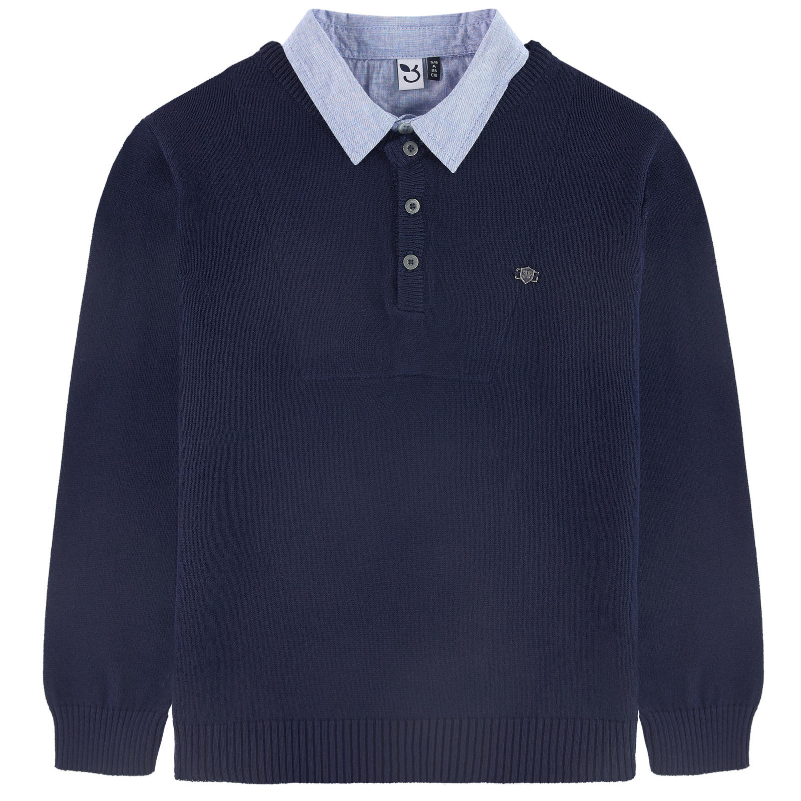 • Pormenores: Malha fina. Gola contrastante. Mangas compridas. Punhos apertados e cós. Malha com nervuras. Cinta de botão no peito.