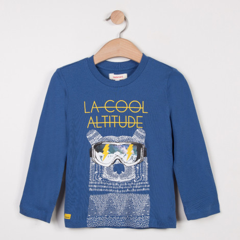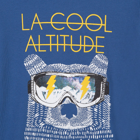 Camisola azul infantil com desenho de urso e texto 'LA COOL ALTITUDE'