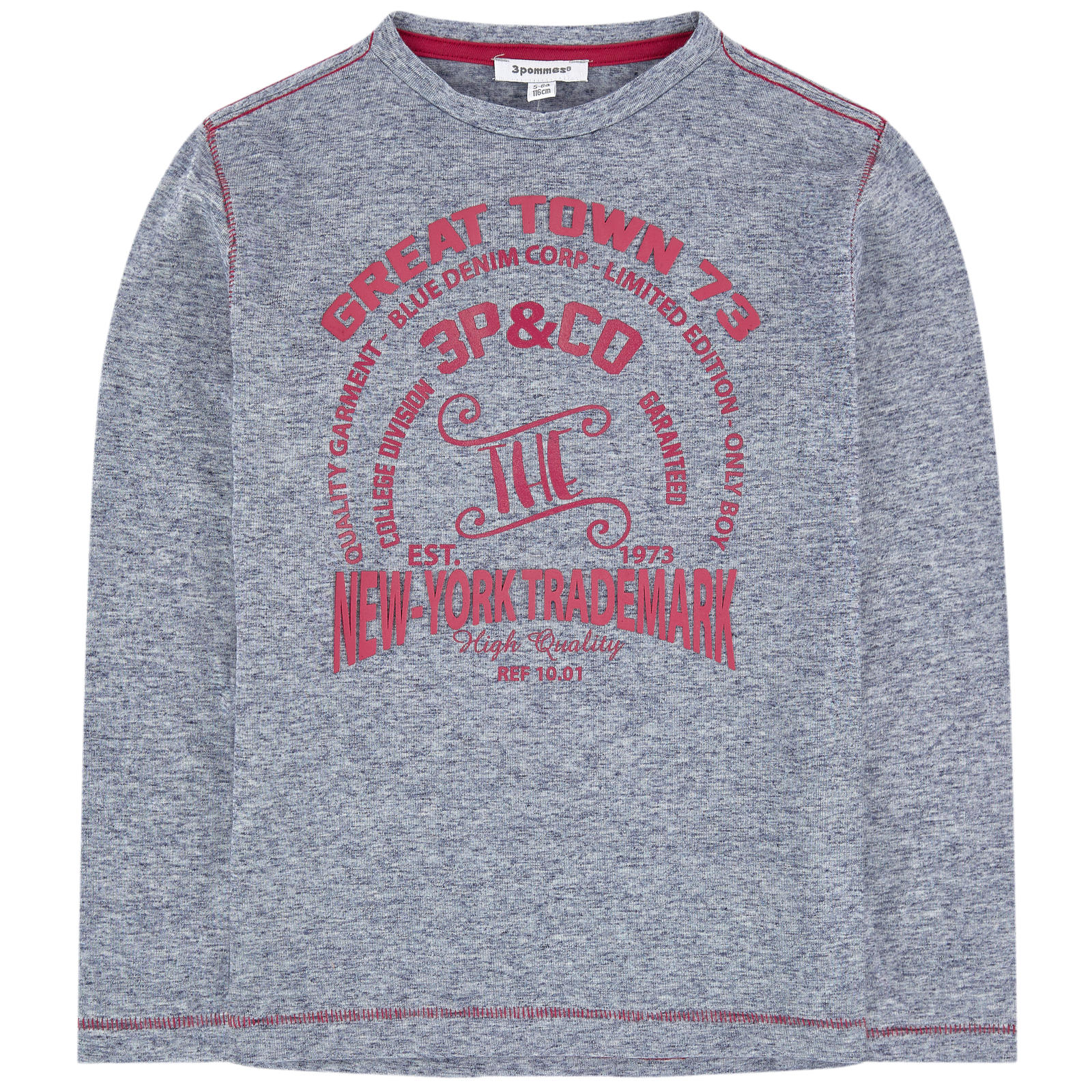 • Pormenores: Manga comprida. Gola redonda. Camisola cinza jaspeado com letras em vermelho.