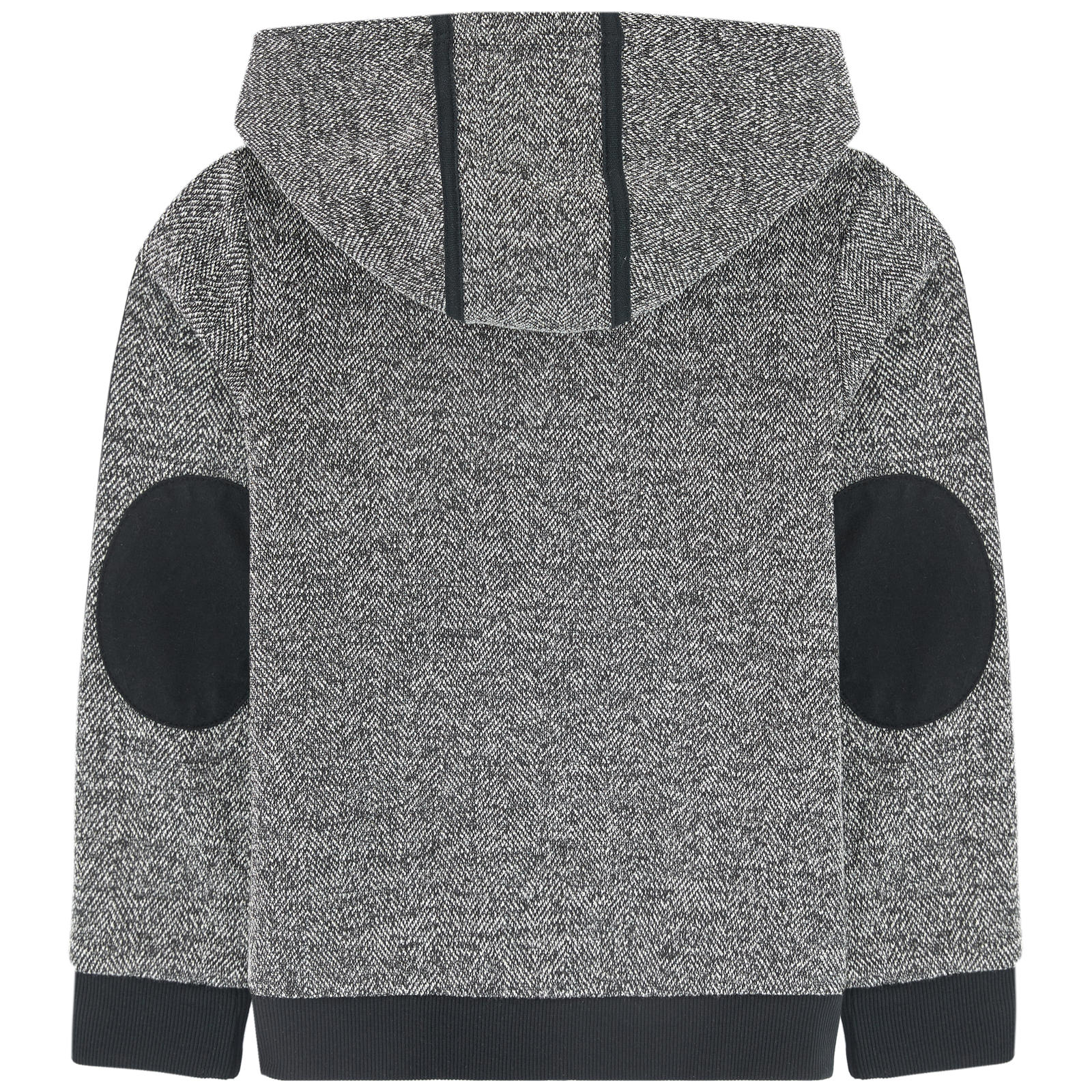 • Pormenores: Casaco desportivo com capuz. Remendo nos cotovelos e no peito. Mangas compridas. Gola Redonda.