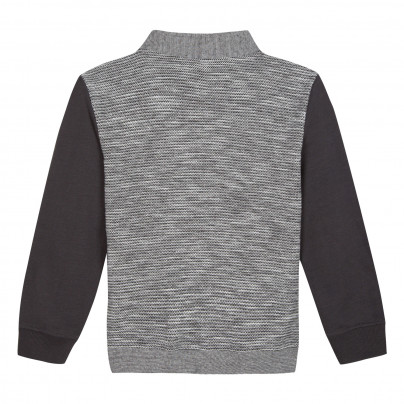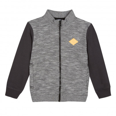 Casaco de criança com fecho zip, mangas pretas e corpo cinzento riscado com emblema amarelo