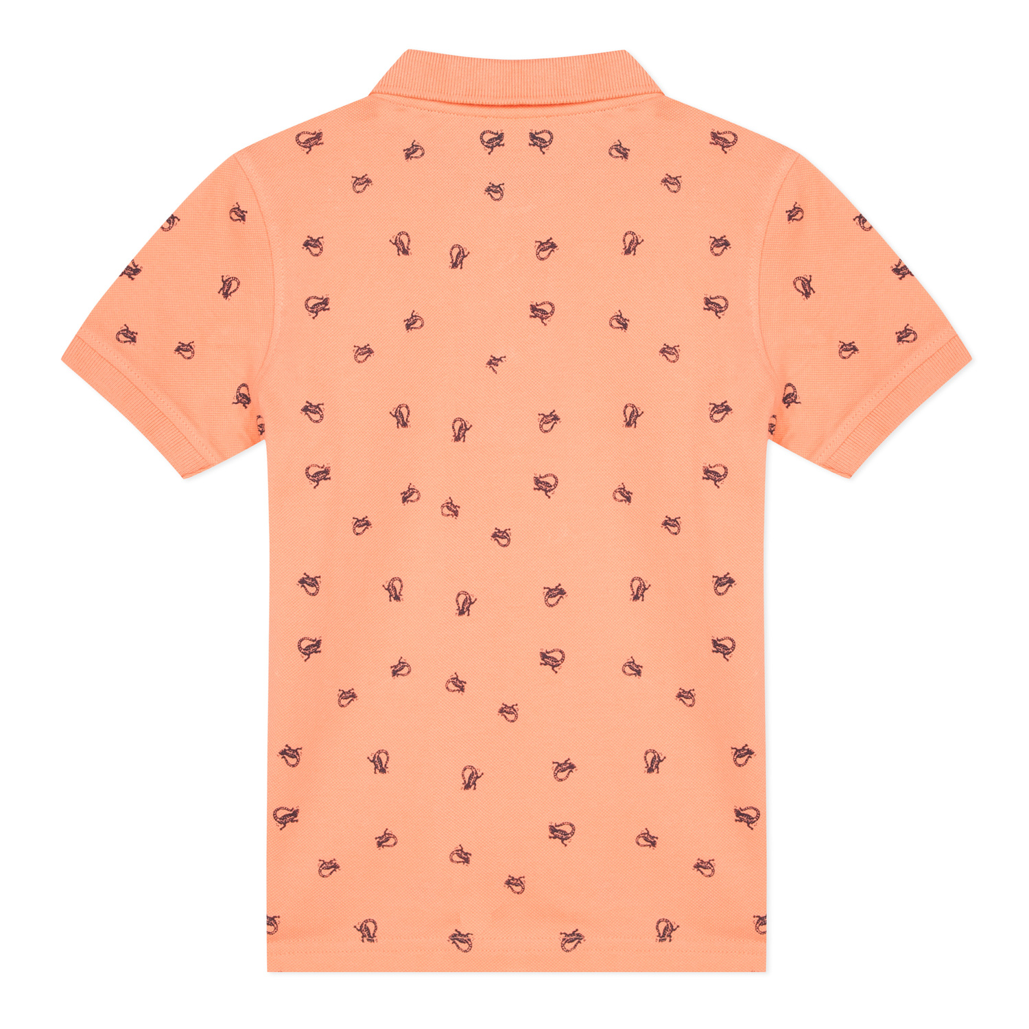 Polo cor de pêssego com pequenos desenhos pretos e etiqueta branca no peito