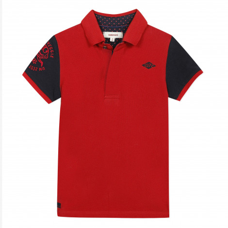 Polo vermelho de manga curta com mangas pretas e detalhes estampados na gola