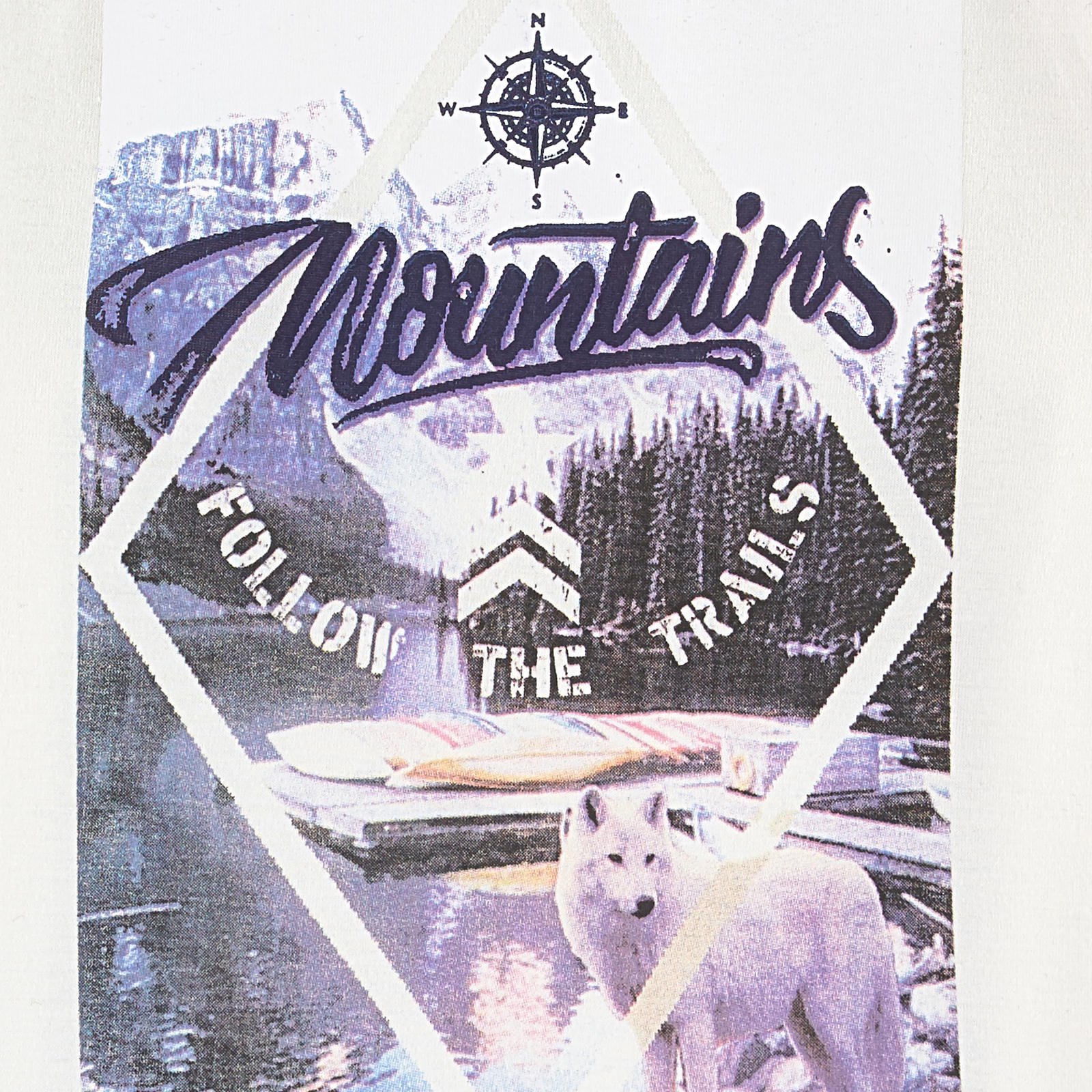 Camisola branca de manga comprida com estampado de montanhas, cão e texto