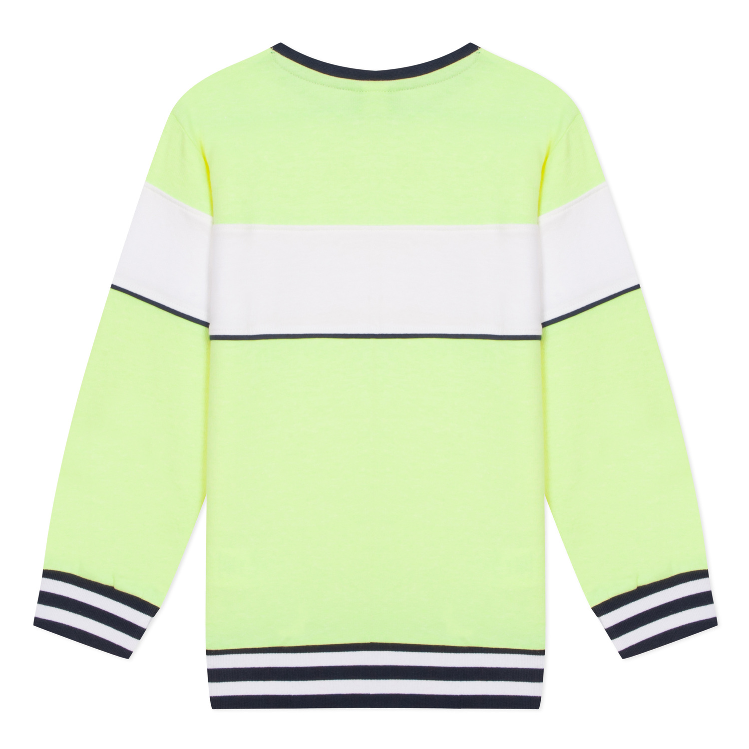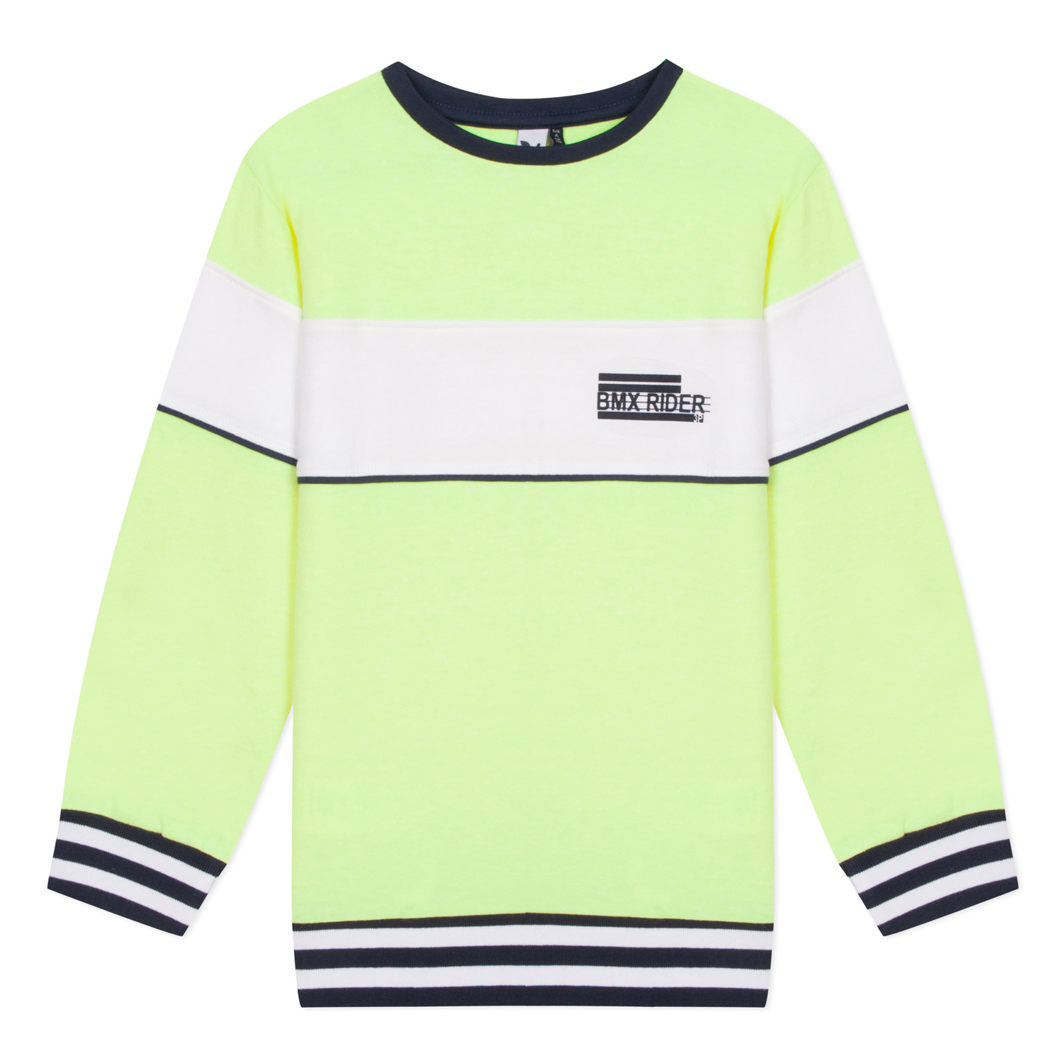 Camisola infantil verde limão e branca com texto BMX RIDER e riscas pretas