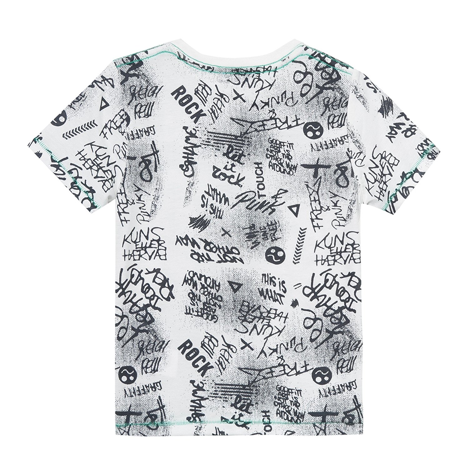 T-shirt branca com texto preto e verde, padrão grafite