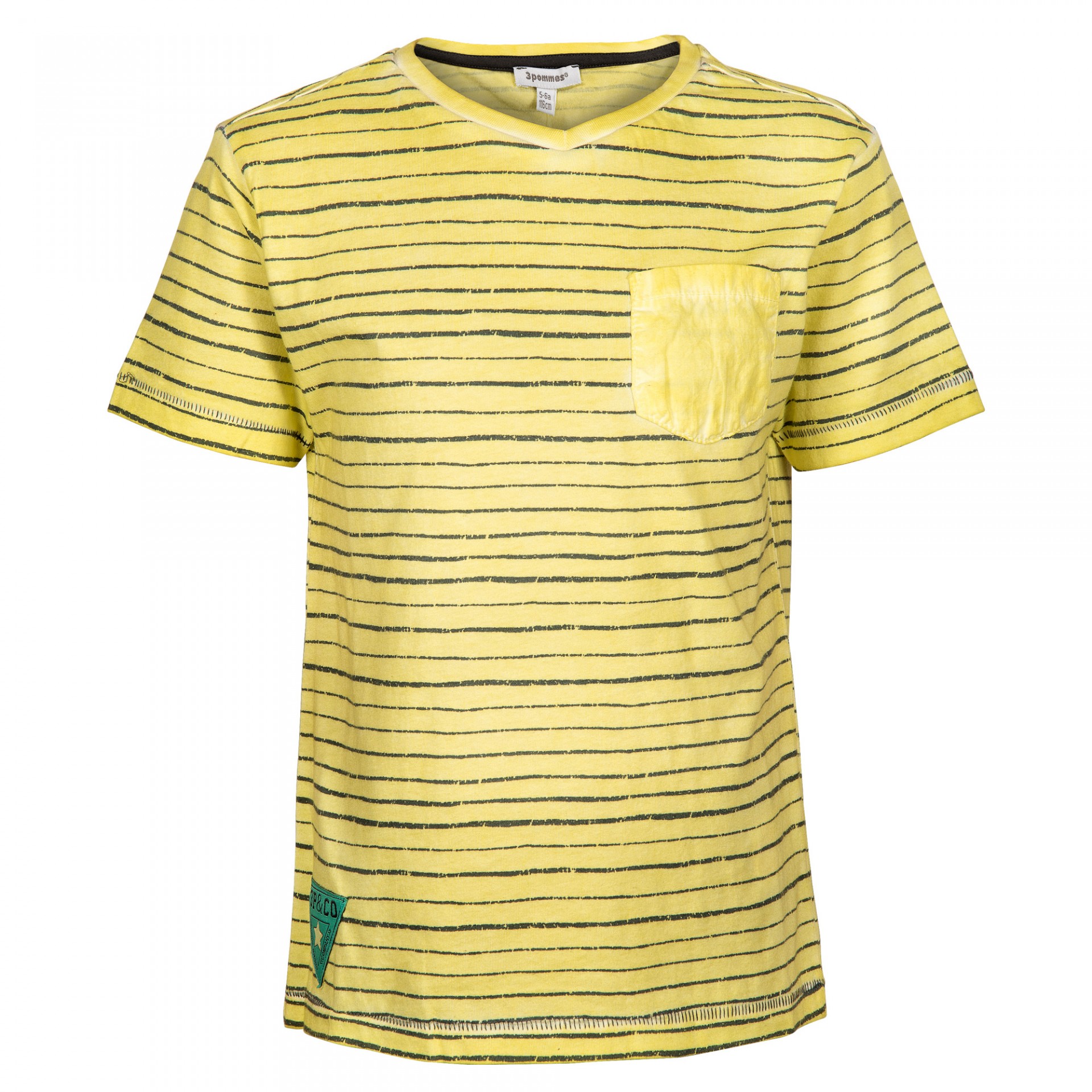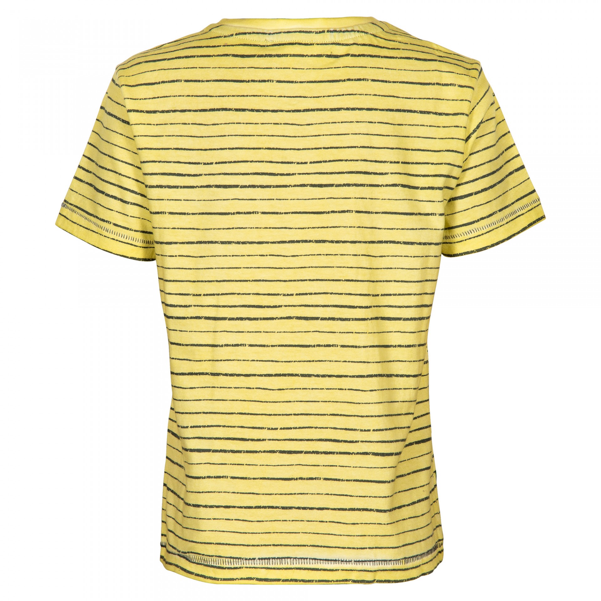 T-shirt amarela riscada preta com bolso amarelo e etiqueta verde
