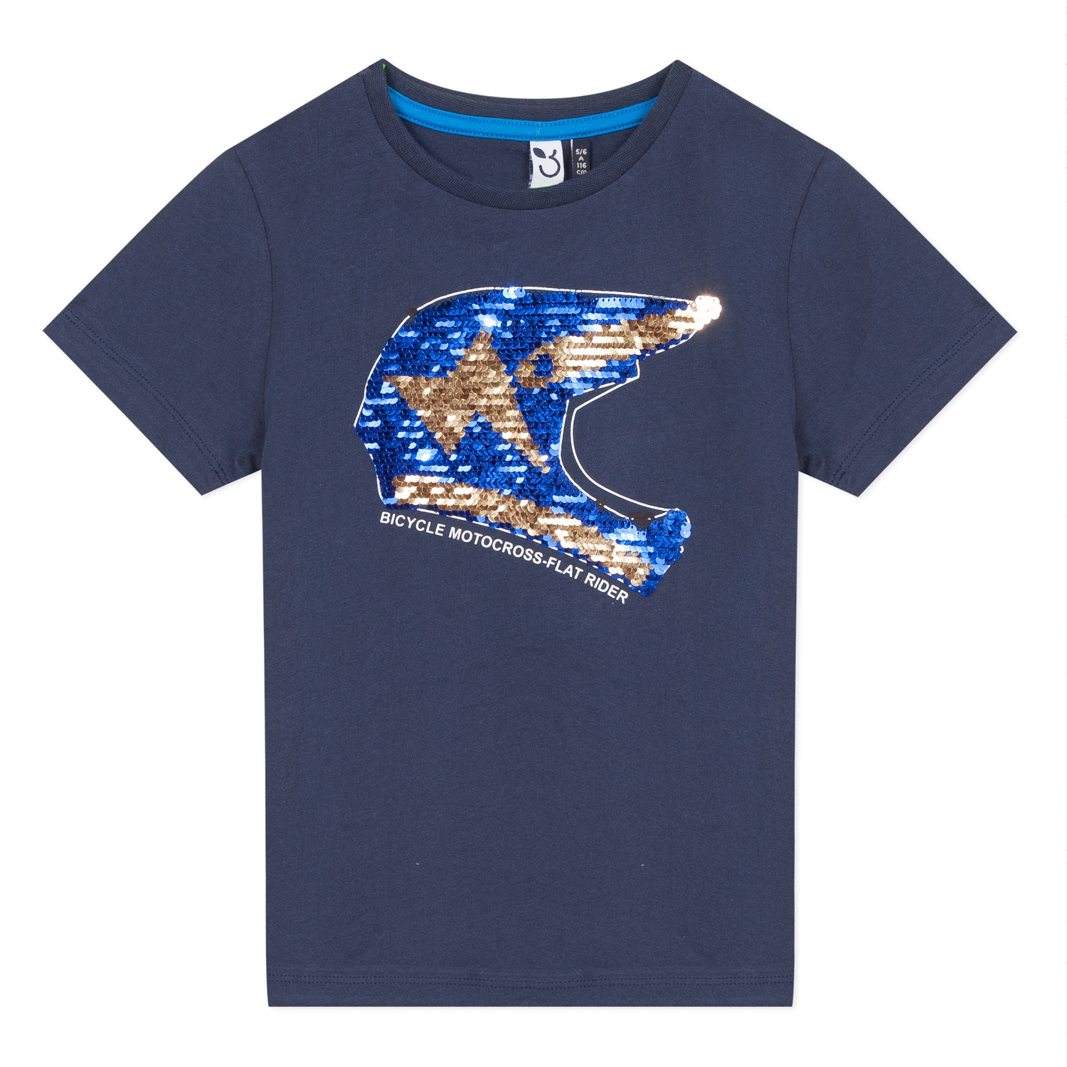 • Detalhes: T-shirt de algodão, azul marinho é animada por um capacete de competição em lantejoulas reversíveis.