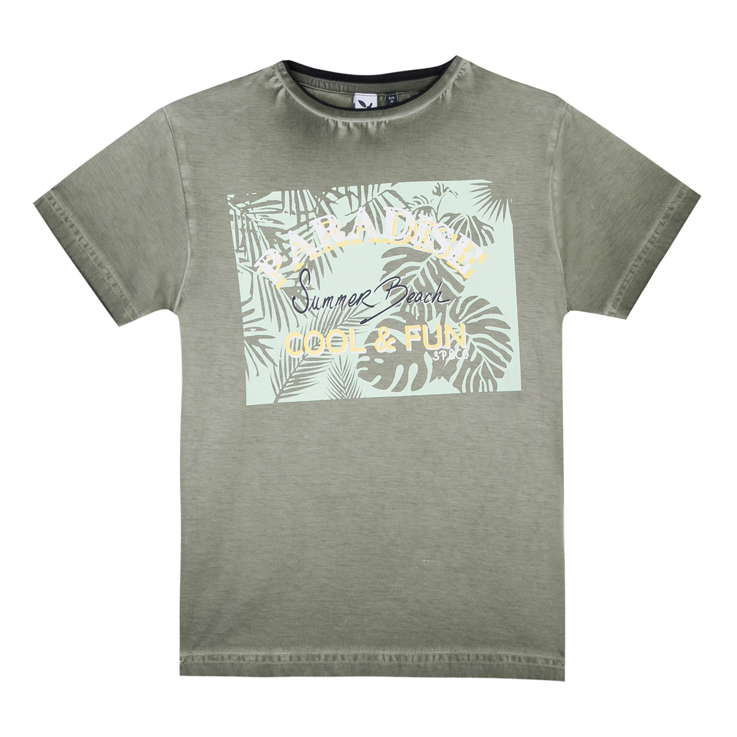 Camiseta cinza esverdeada com estampado de folhas tropicais e texto