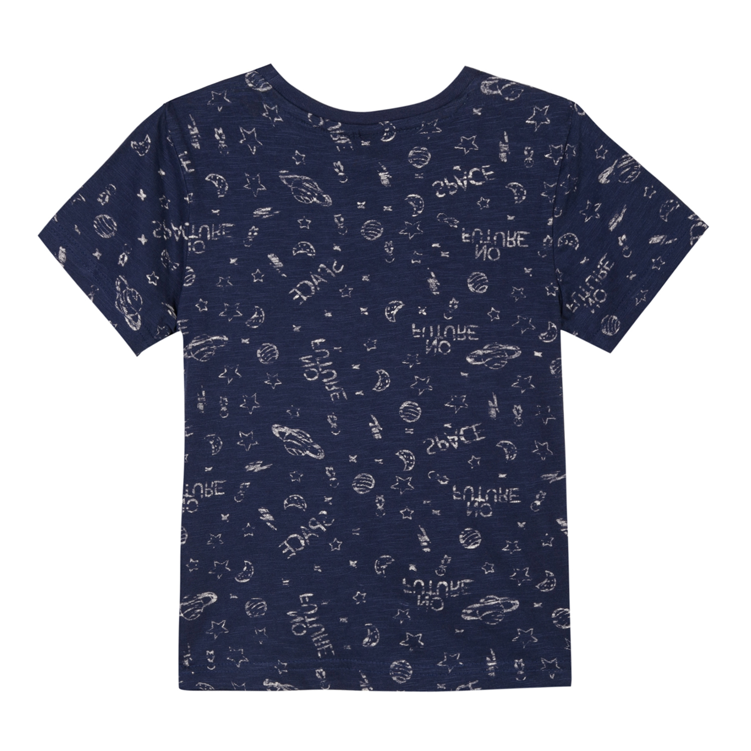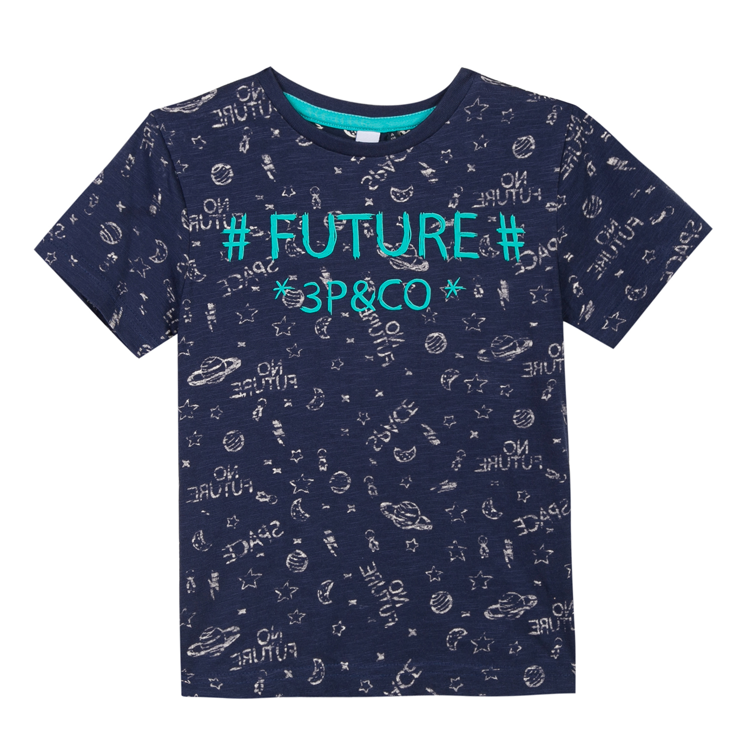 T-shirt azul escura com texto #FUTURE# 3P&CO em azul claro e estampado espacial branco