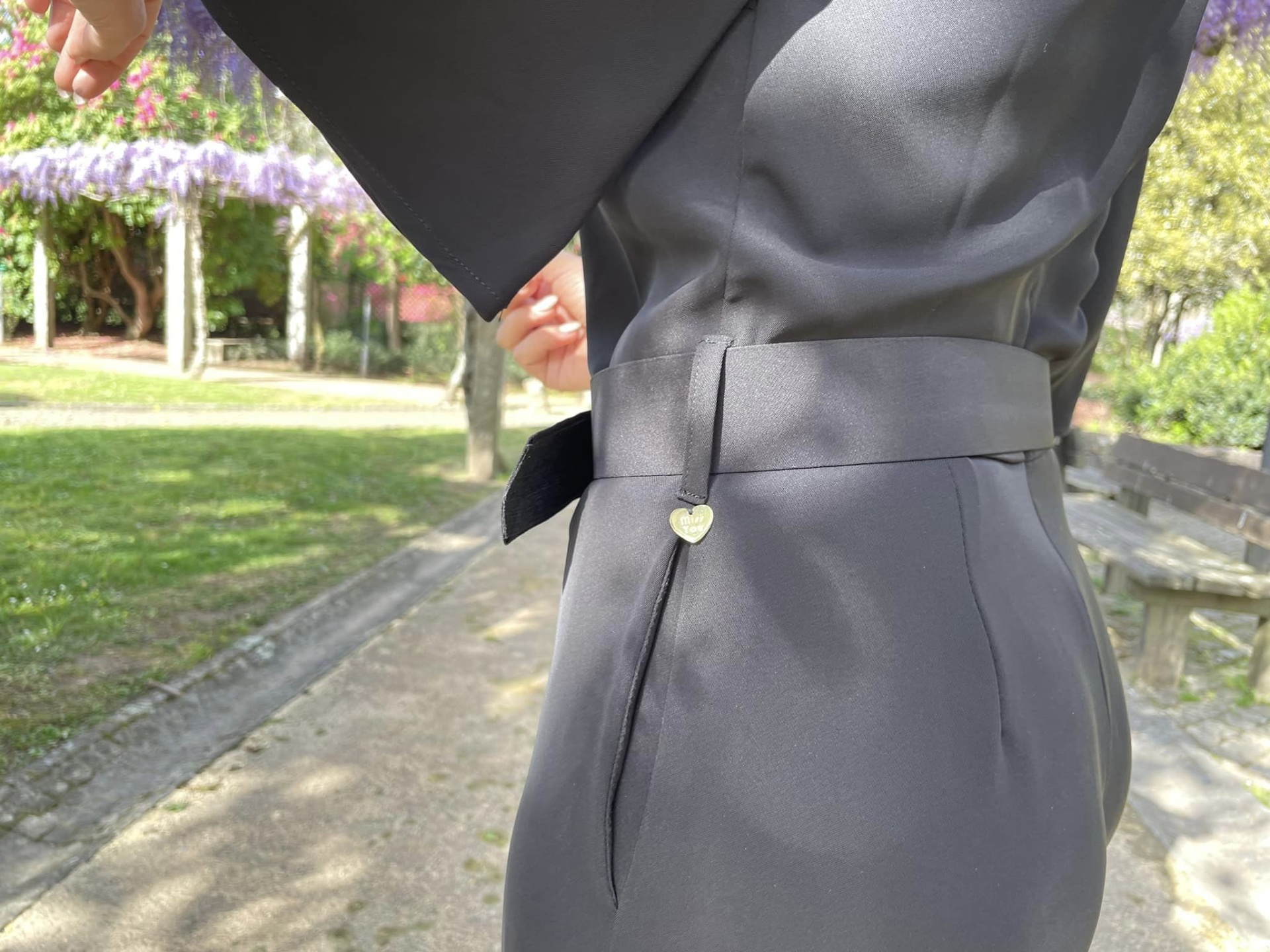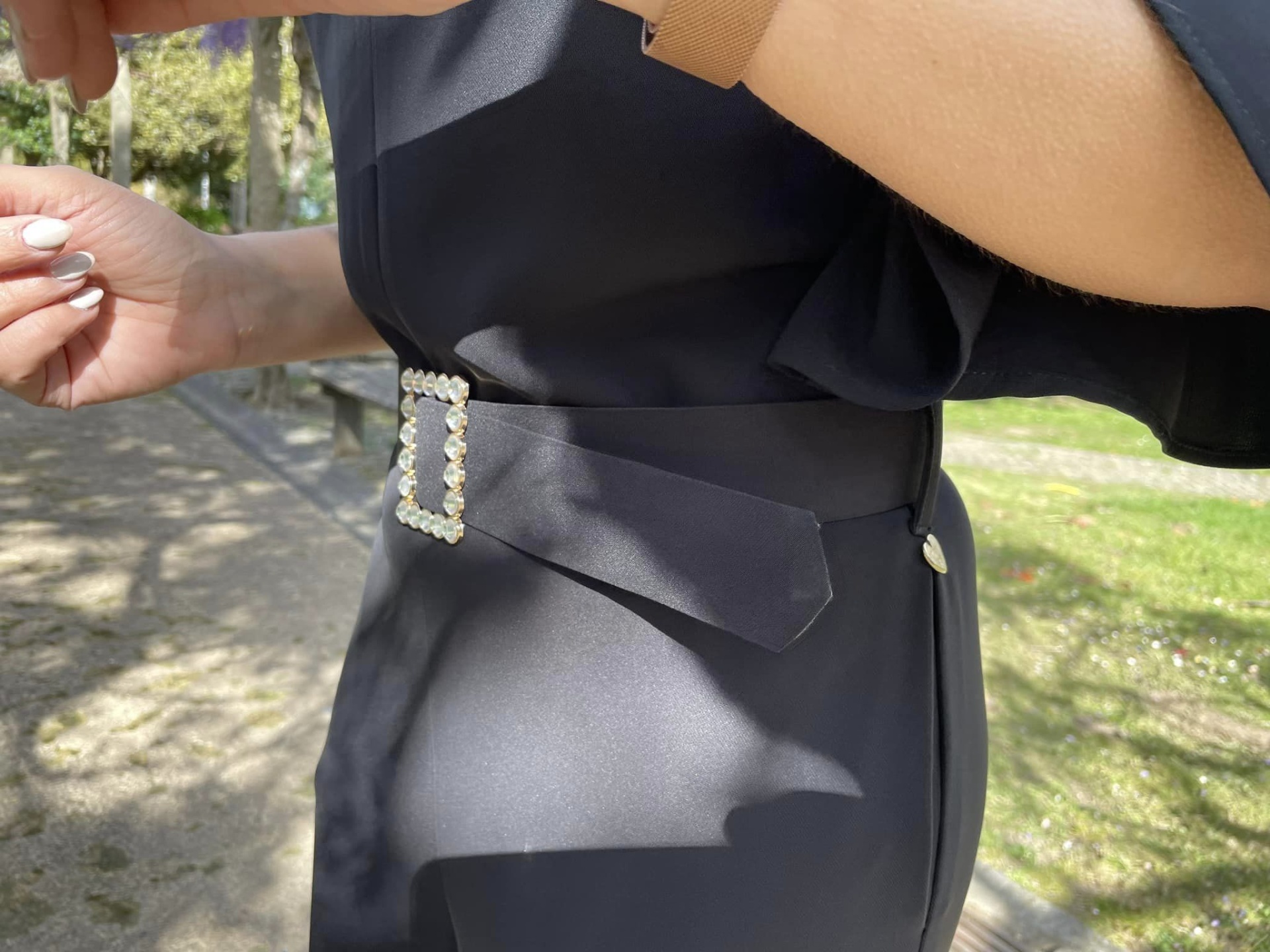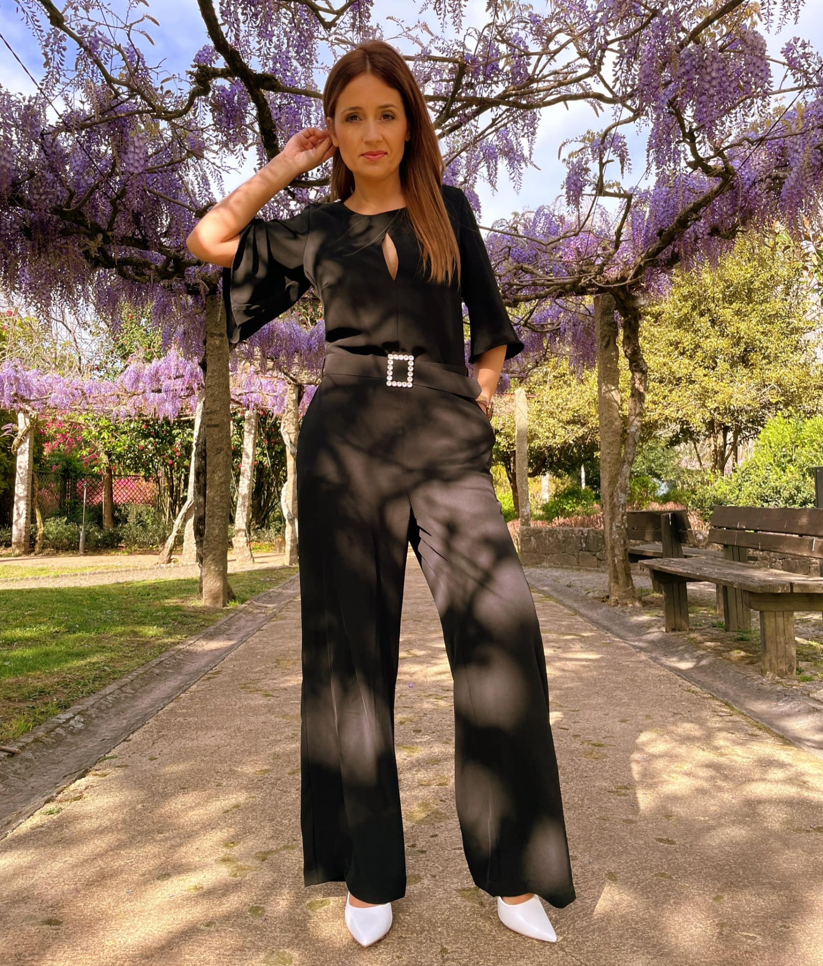 - Detalhes: Macacão fluído com calça larga. Cinto incluído com pedras prateadas. Manga larga.