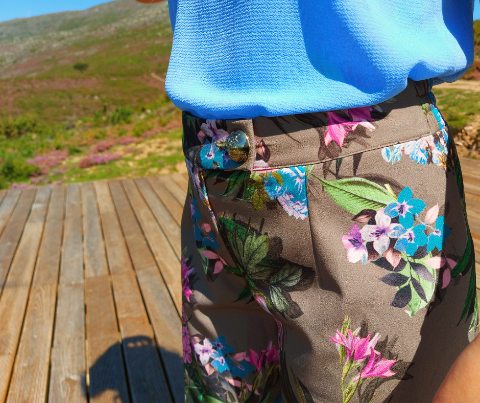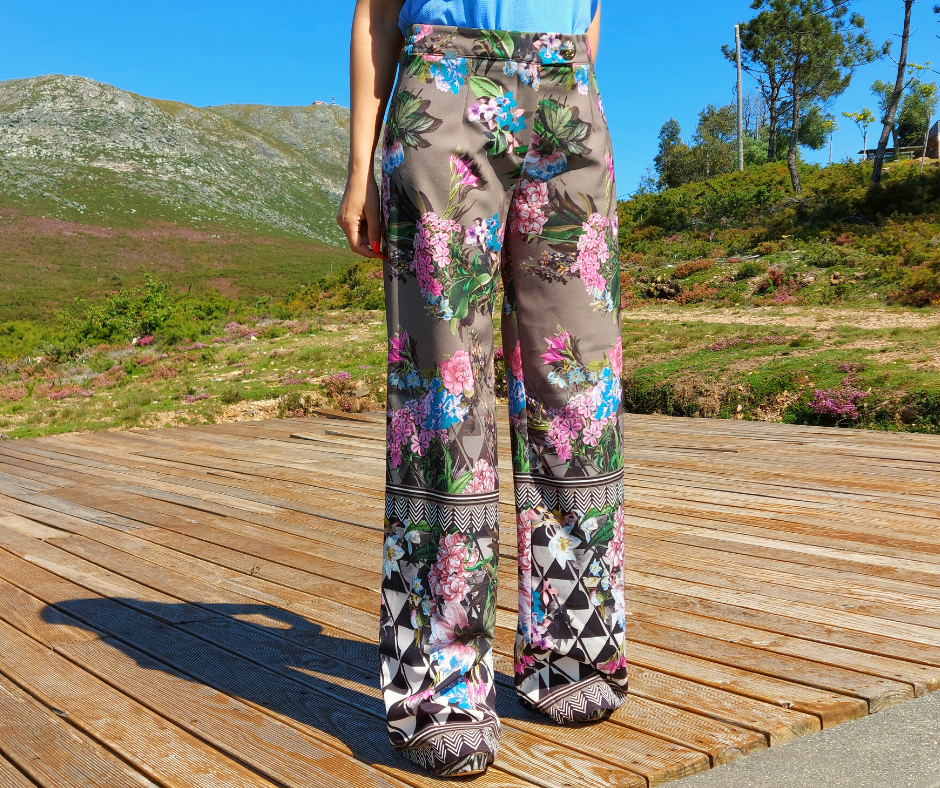 • Detalhes: Calça verde com padrão floral multi colorido. Cintura alta com elástico na parte de trás. Modelo largo.