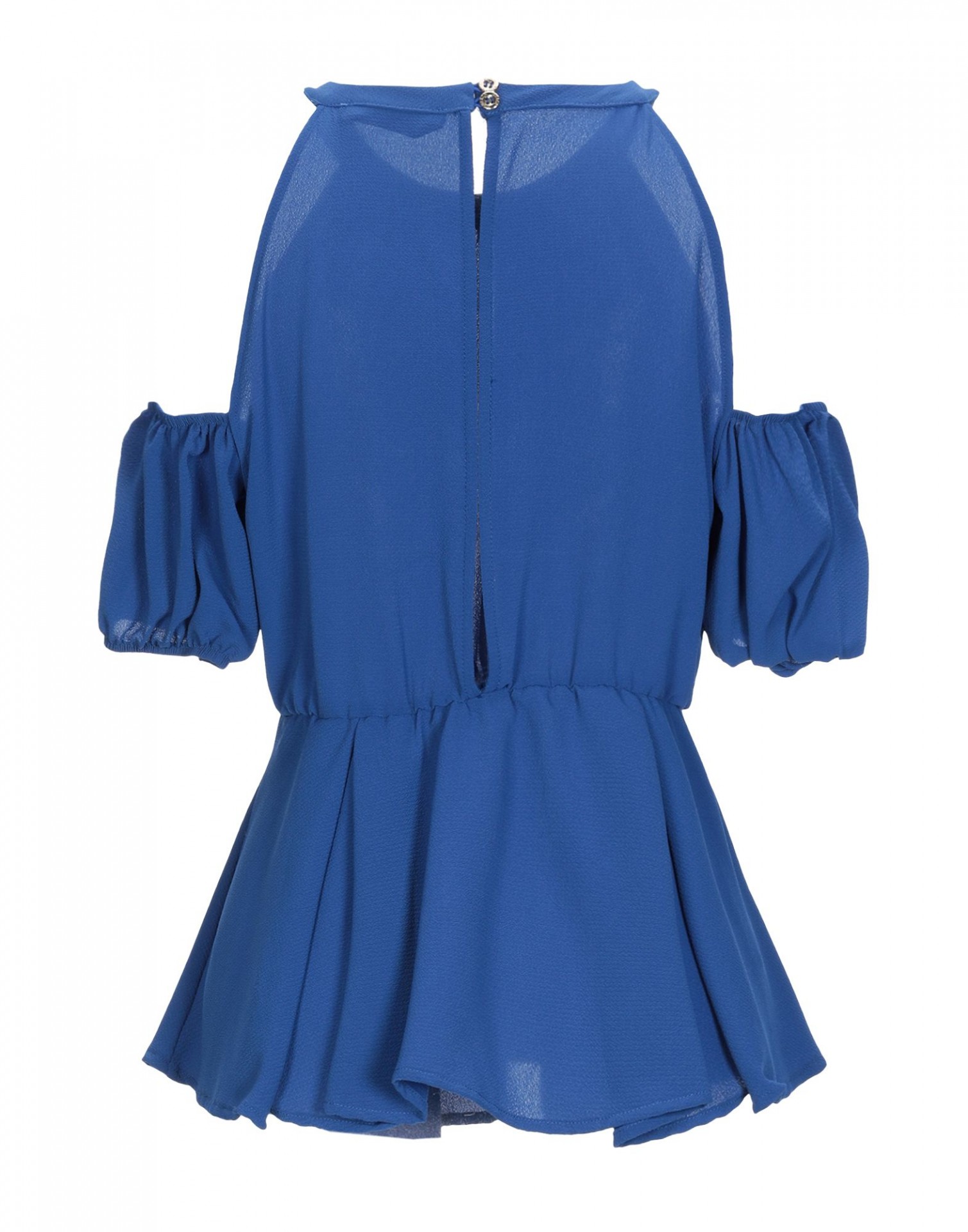 Blusa feminina azul com decote halter e mangas curtas vazadas