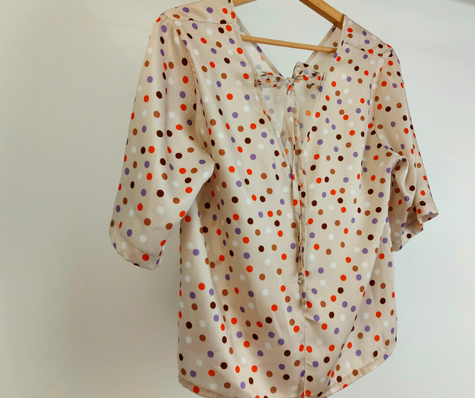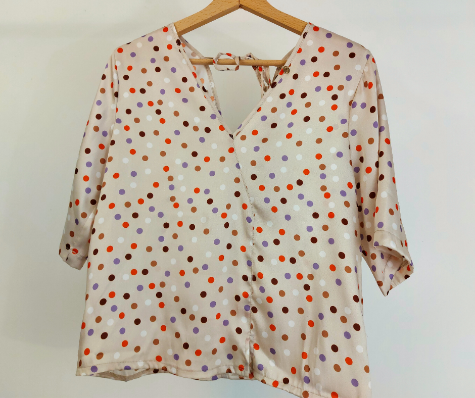 • Detalhes: Blusa bege com padrão de bolinhas multicoloridas.