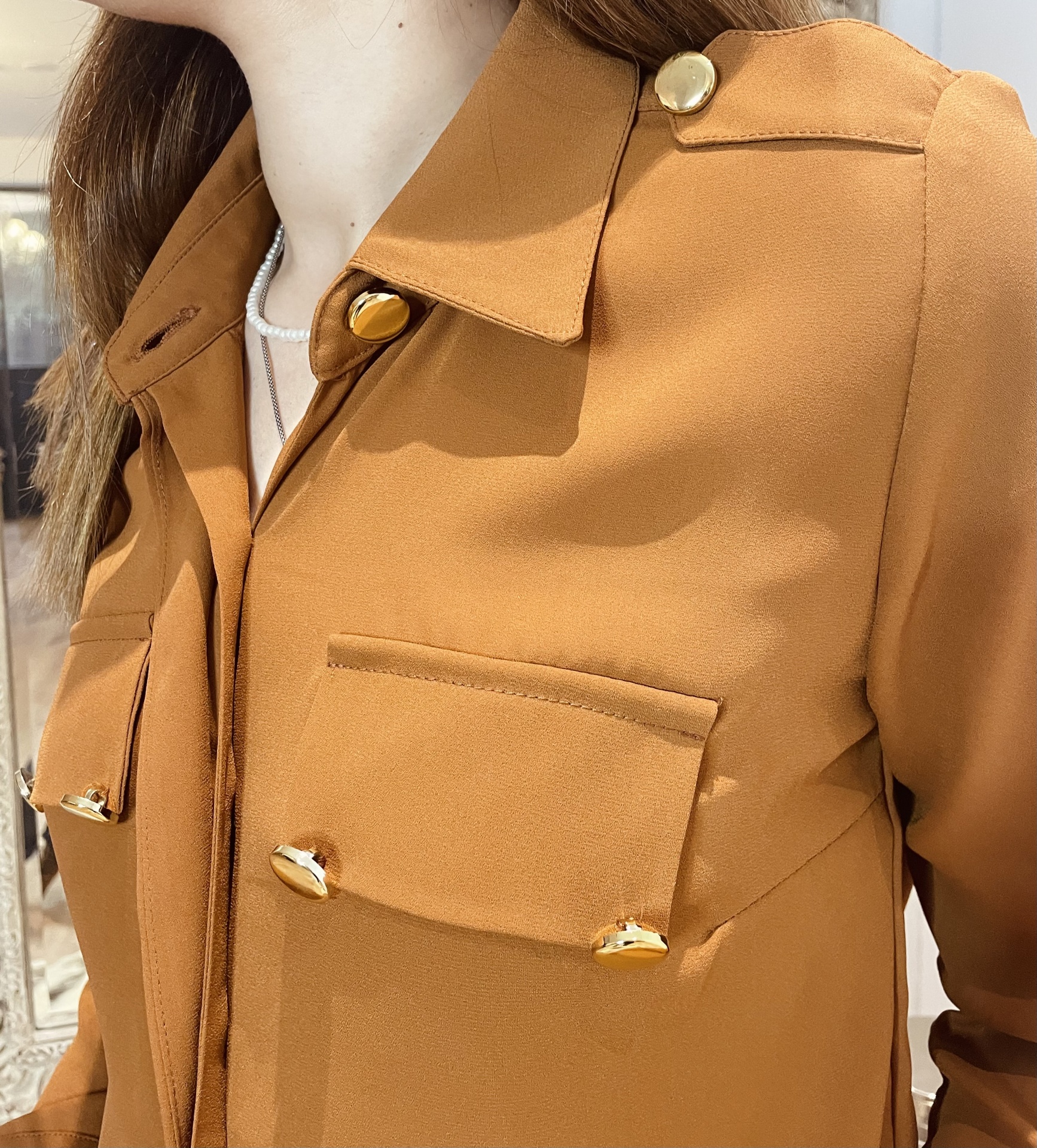 - Detalhes: Blusa com botões dourados. Mais comprida na parte de trás. Nó frontal.