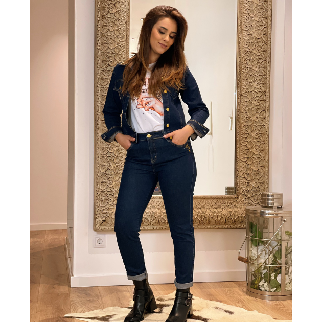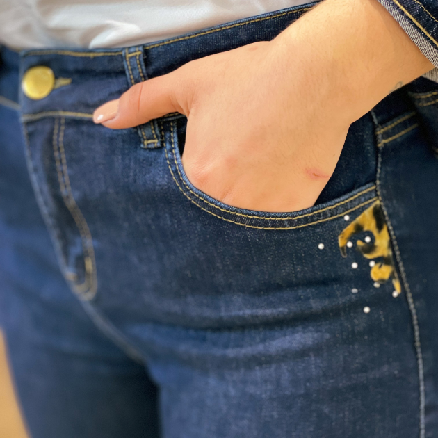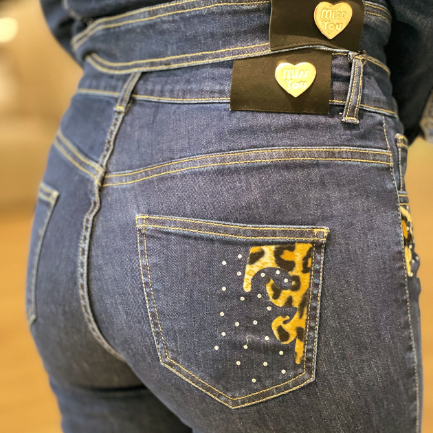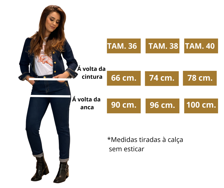 - Detalhes: Calça de ganga de cintura alta. Modeo skinny. Detalhes de animal print e brilhos nos bolsos frontais e traseiros.