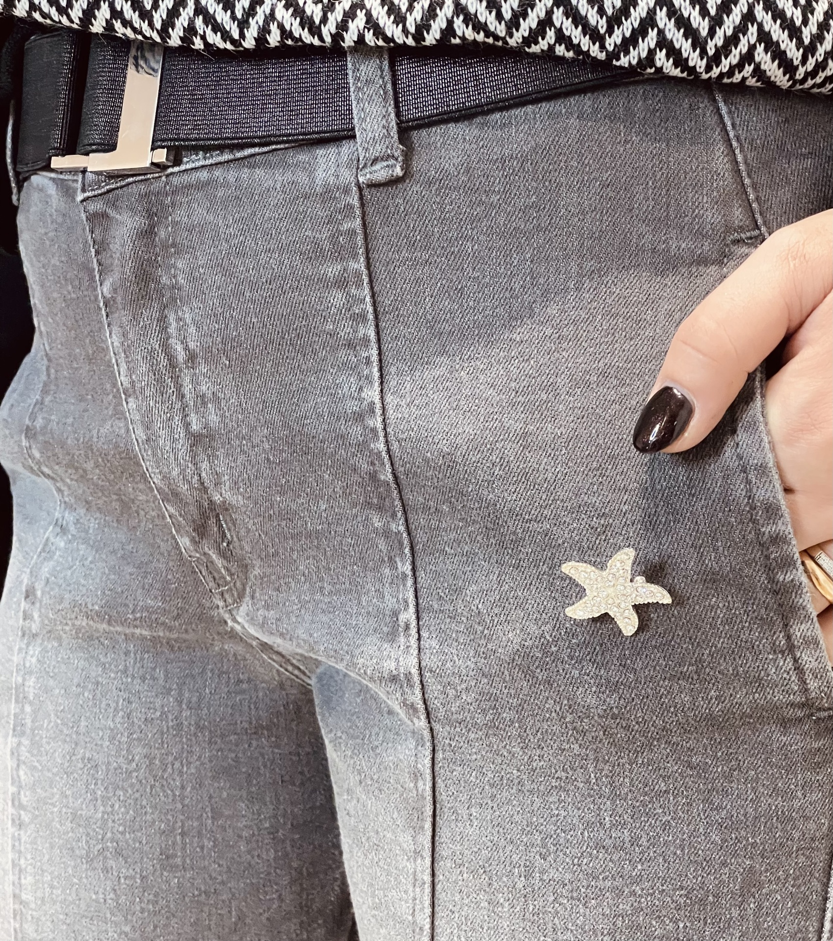 - Detalhes: Calça modelo justo. Cintura média/alta. Cinto preto incluído. Aplique em forma de estrela, amovível.