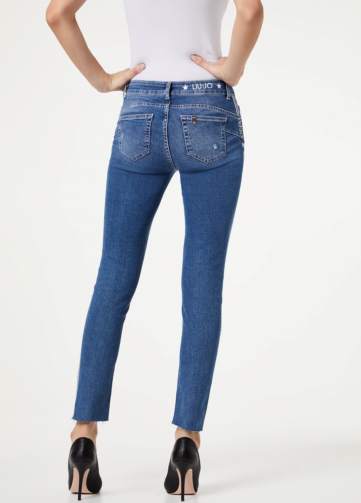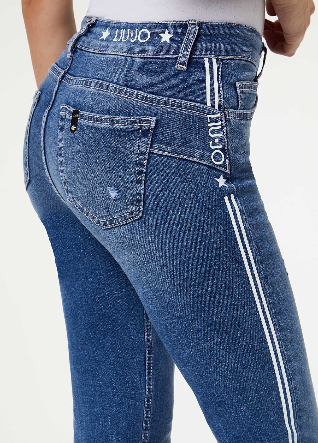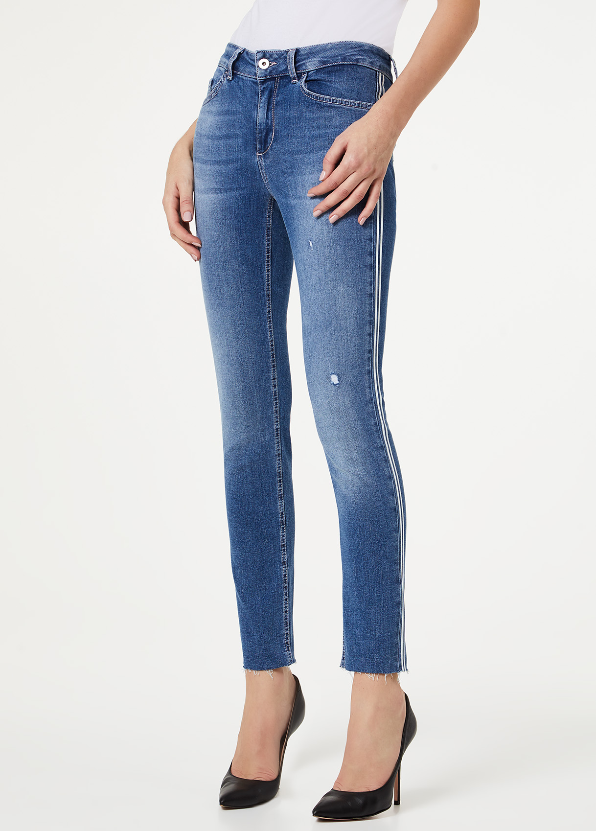 • Detalhes: Calças de ganga com efeito riscado e rasgado. Bainhas inacabadas e uma faixa de logotipo na lateral.