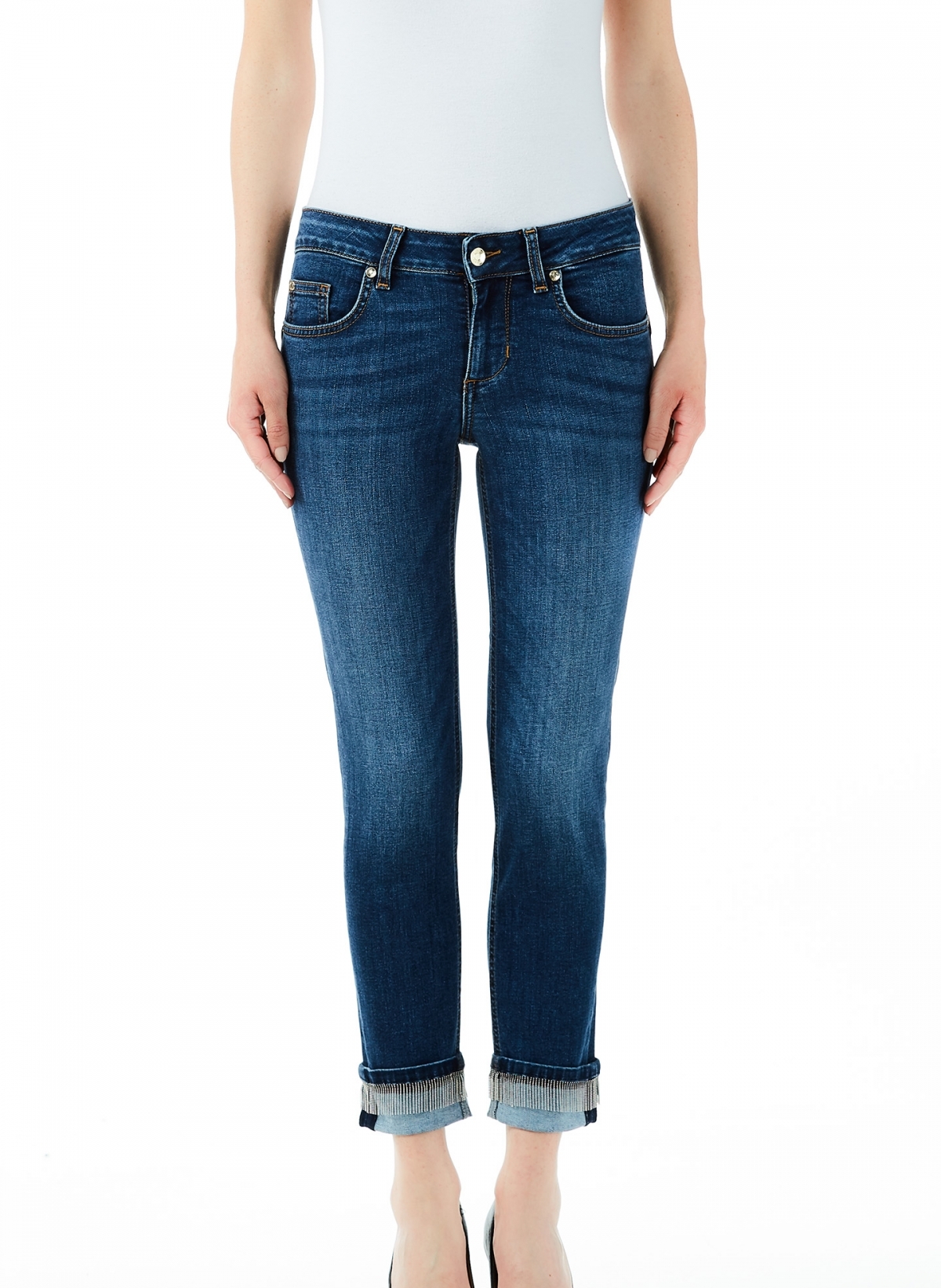 • Detalhes: Calça de ganga, lavagem média com detalhes na base inferior. Franjas em prateado.